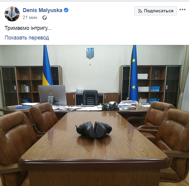 16 грудня Малюська виклав у соцмережі фото зі свого кабінету з черевиками на столі. Загадковий кадр з'явився на сторінці міністра на фоні чуток про відставку.А на початку грудня Малюська виліз з ногами на стіл, відзвітувавшись про 100 днів нібито продуктивної роботи.Нагадаємо, 17 січня, на третій день після оприлюднення плівок з наради Олексія Гончарука, прем'єр-міністр написав заяву про відставку і виступив в Раді під крики "Ганьба!"