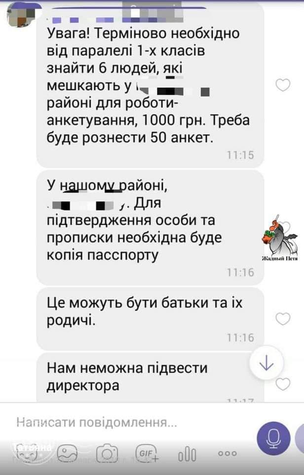 «Увага! Терміново необхідно від паралелі 1-х класів знайти 6 осіб, які проживають в районі для роботи-анкетування, 1000 грн. Потрібно буде рознести 50 анкет. Це можуть бути батьки та їхні родичі. Нам не можна підставити директора», – випливає з тексту повідомлення.