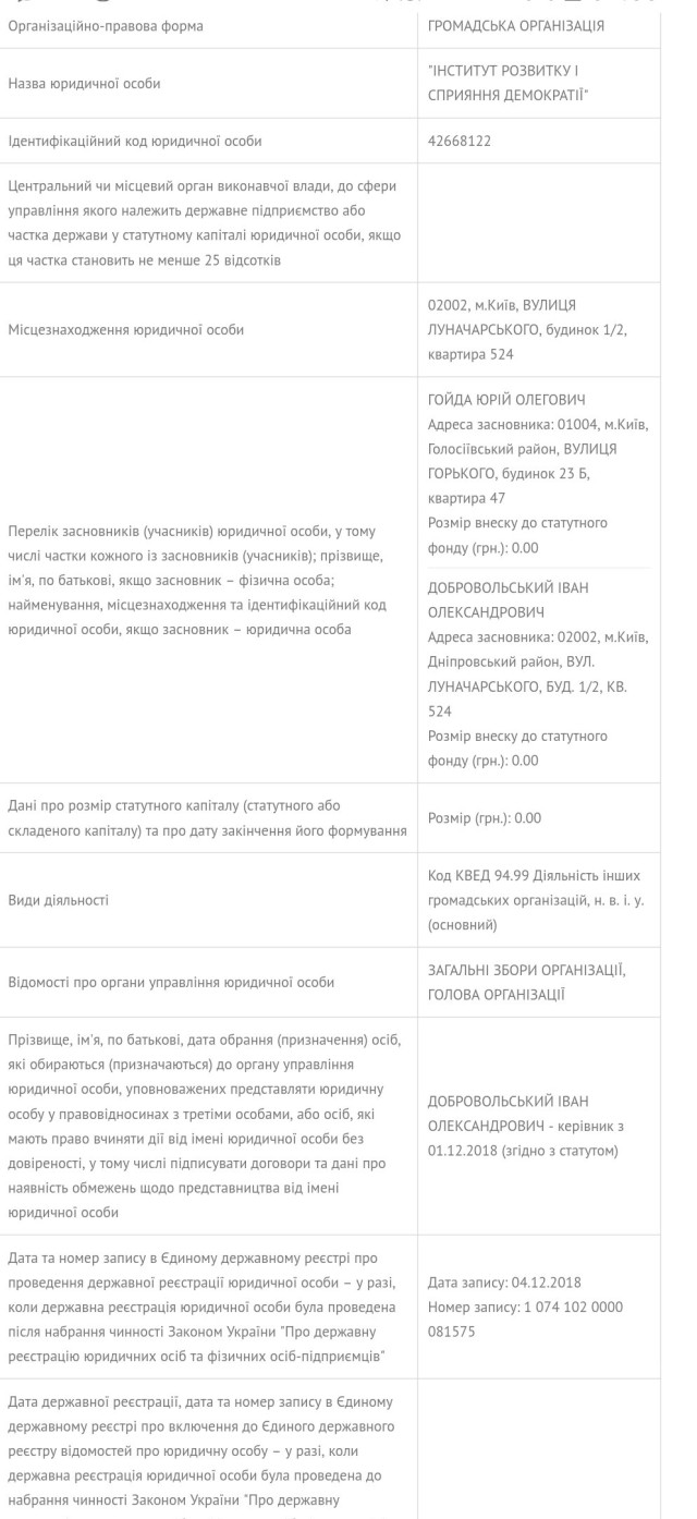 Згідно з даними реєстру Мін’юсту, подібна організація була створена зовсім недавно – на початку грудня. В її засновниках значаться двоє молодих киян – Юрій Гойда і Іван Добровольський. Телефон інституту, вказаний в реєстрі, виявився недійсним, при цьому імена молодих хлопців-засновників збігаються з користувачами Facebook, у яких зазначено досвід роботи з БПП.