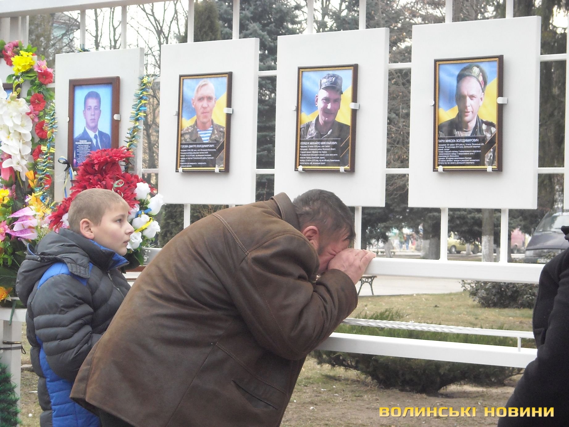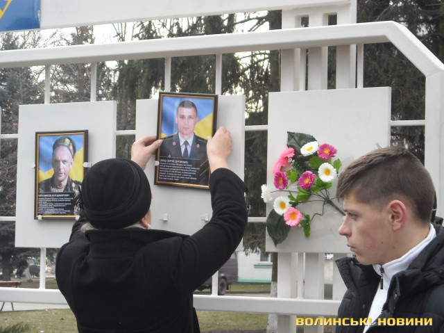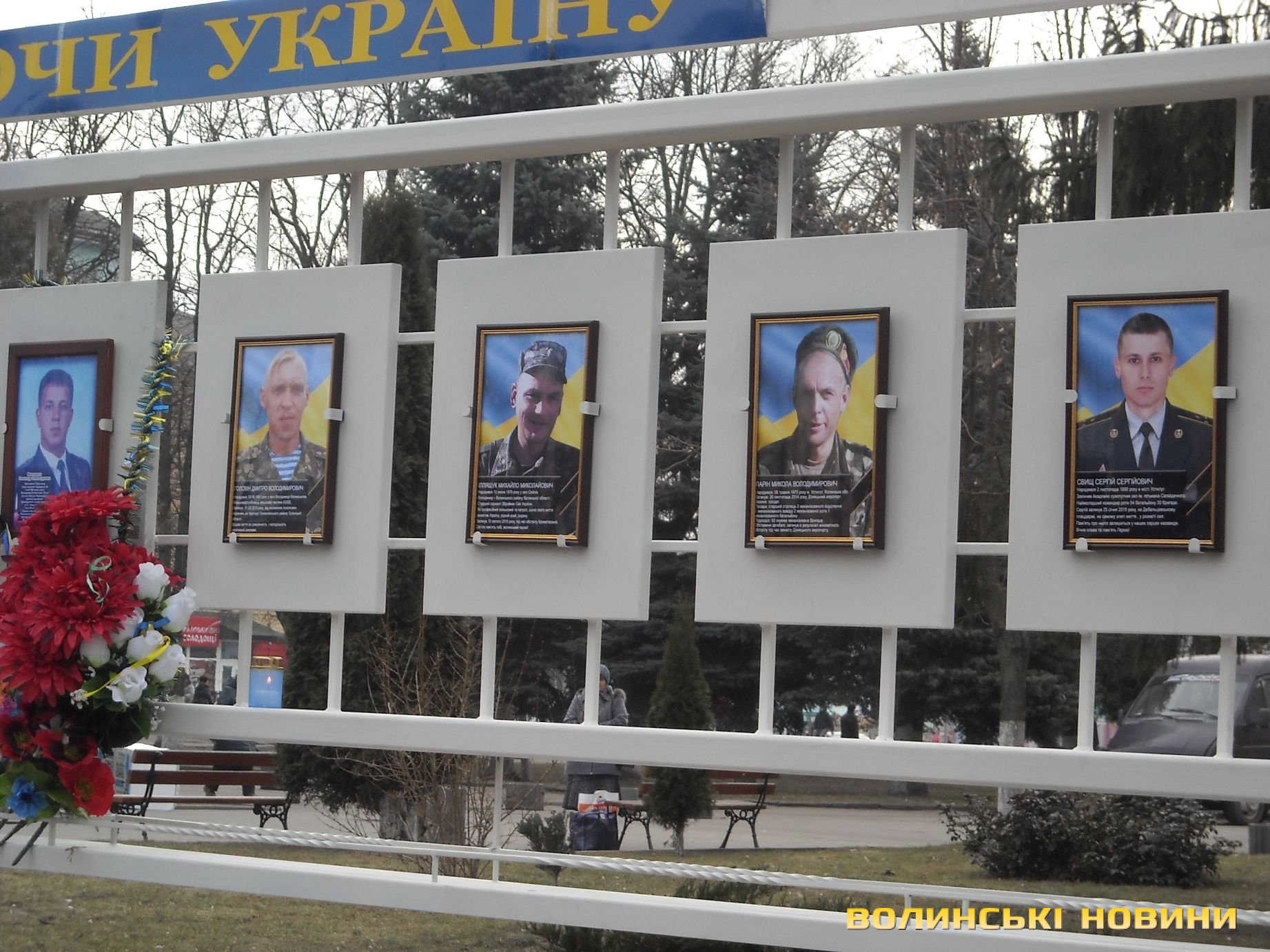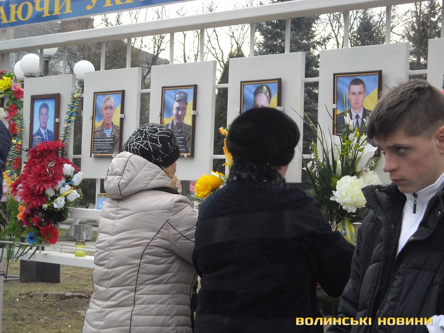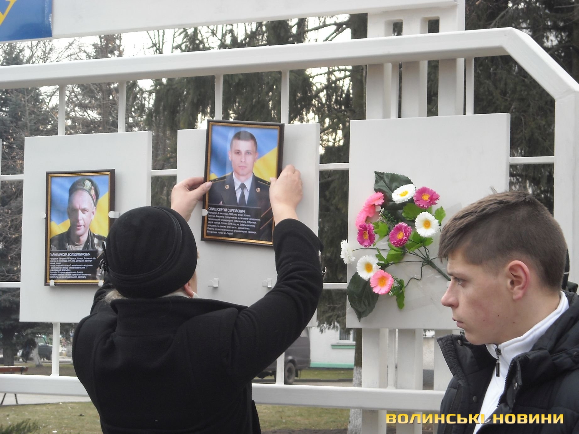 Вшановували їх перед меморіальною дошкою на якій увіковічені в портретах загиблі в АТО володимир-волинці. До вже існуючи портретів додали ще чотири з іменами воїнів, що загинули, обороняючи Україну від підступного ворога: Сергія Свища, Дмитра Головіна, Михайла Ілляшука, Миколи Ларіна.
