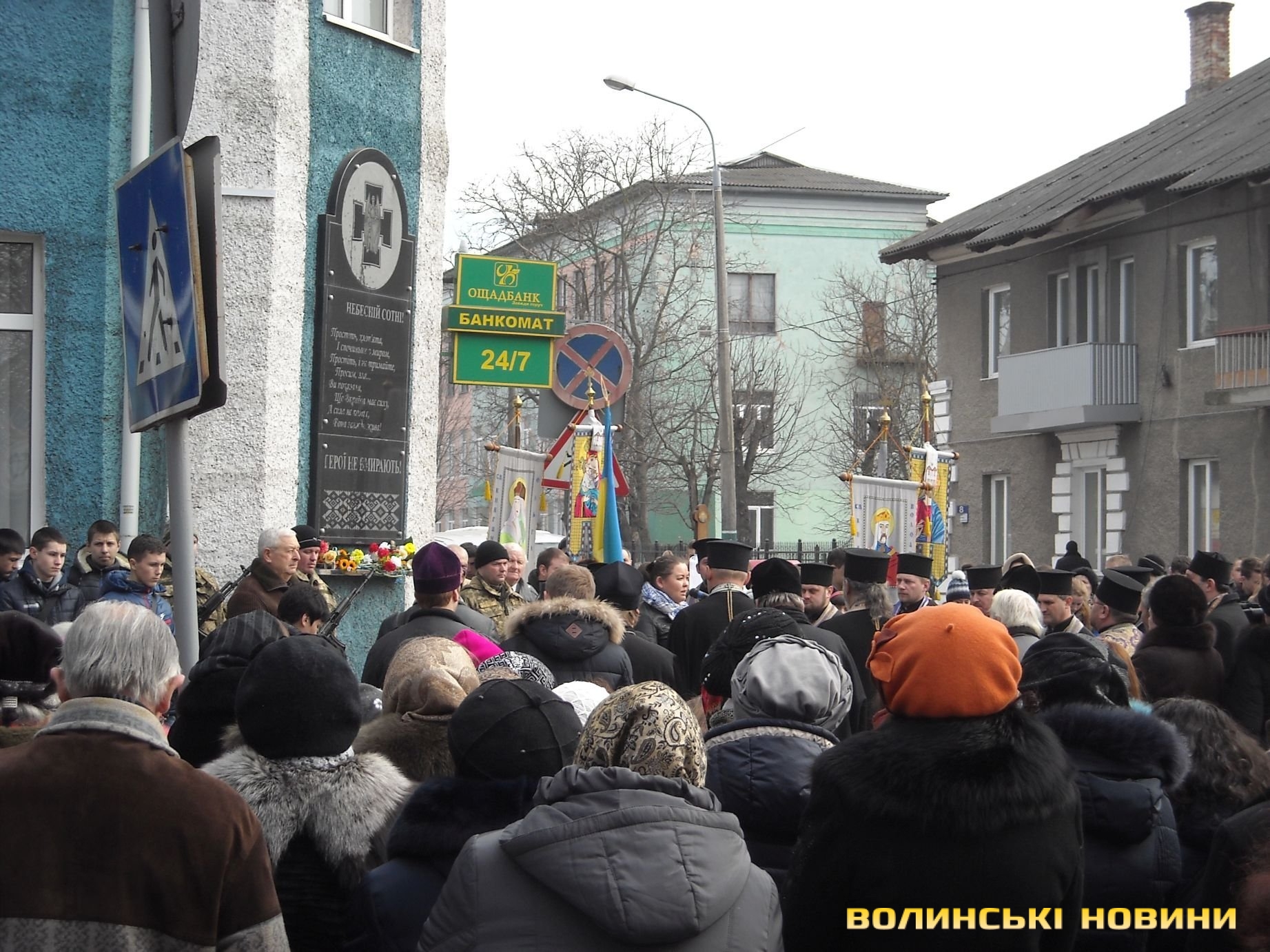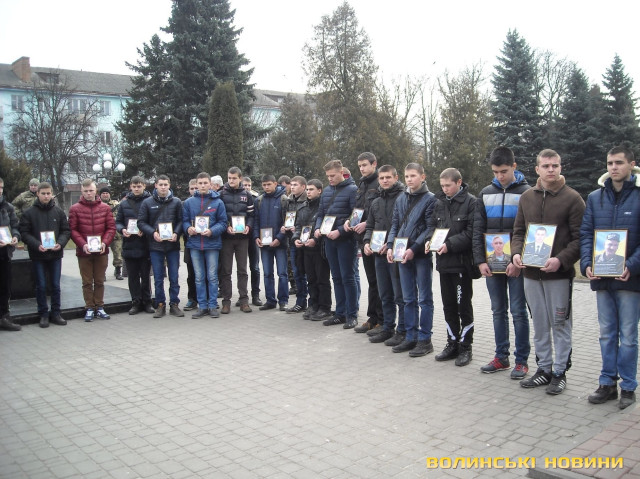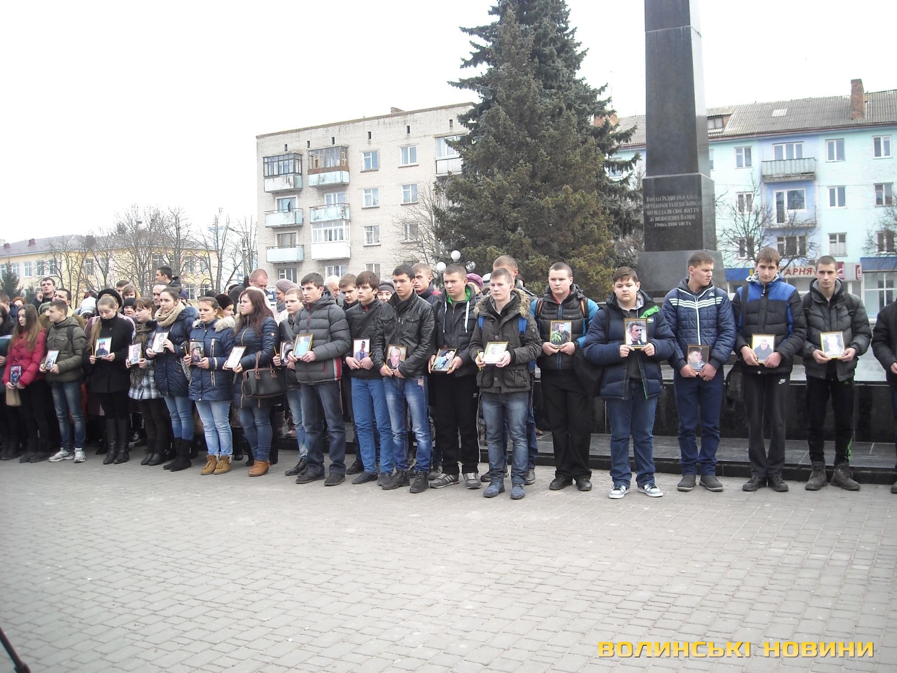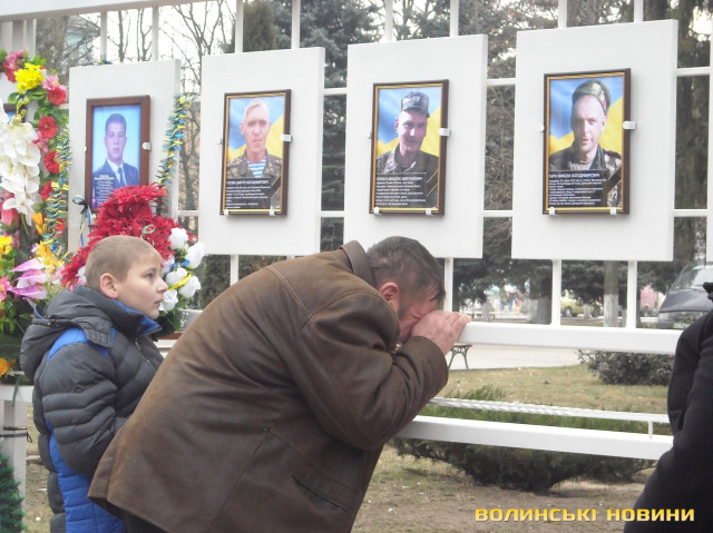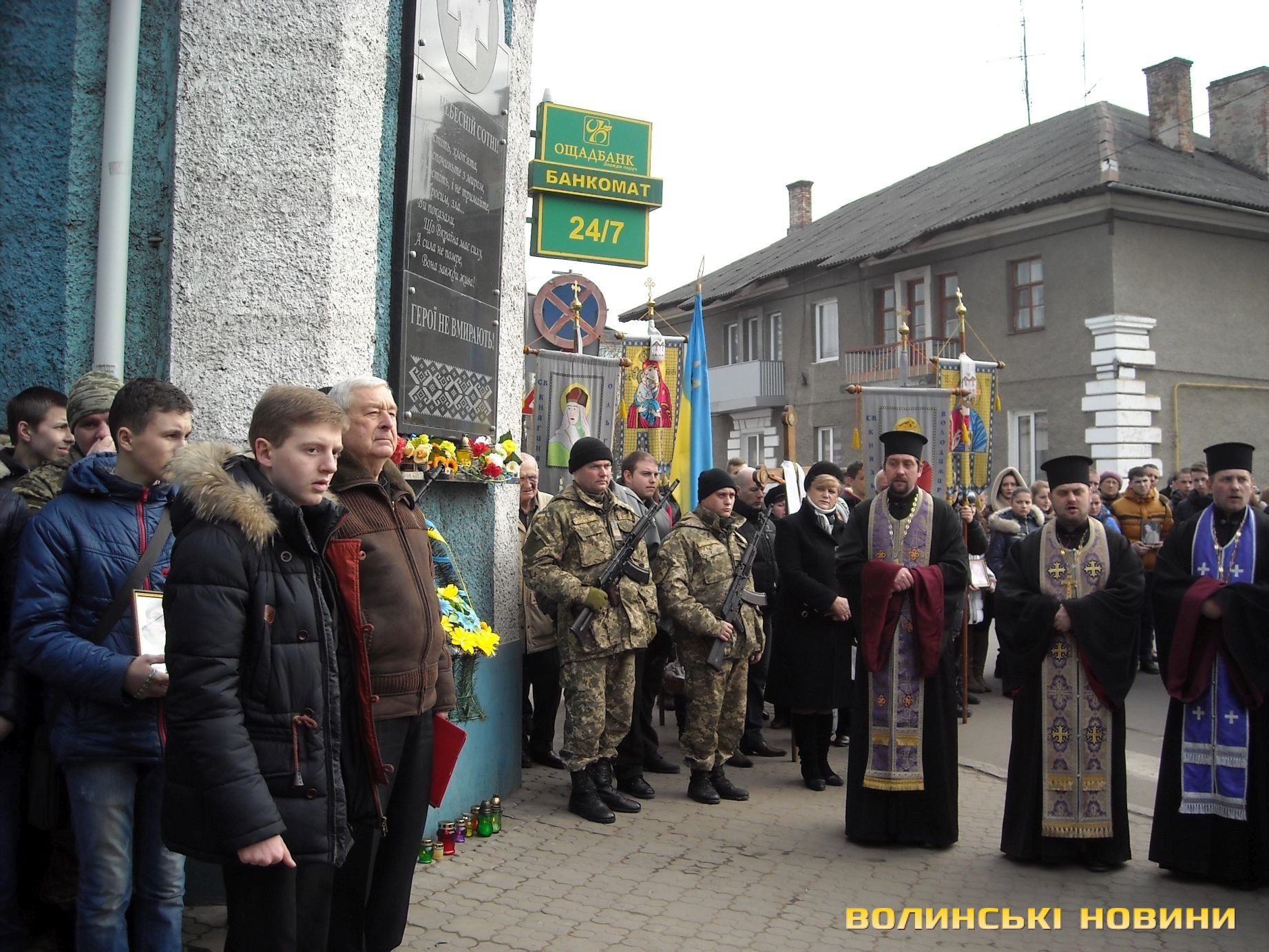 Вшановували їх перед меморіальною дошкою на якій увіковічені в портретах загиблі в АТО володимир-волинці. До вже існуючи портретів додали ще чотири з іменами воїнів, що загинули, обороняючи Україну від підступного ворога: Сергія Свища, Дмитра Головіна, Михайла Ілляшука, Миколи Ларіна.