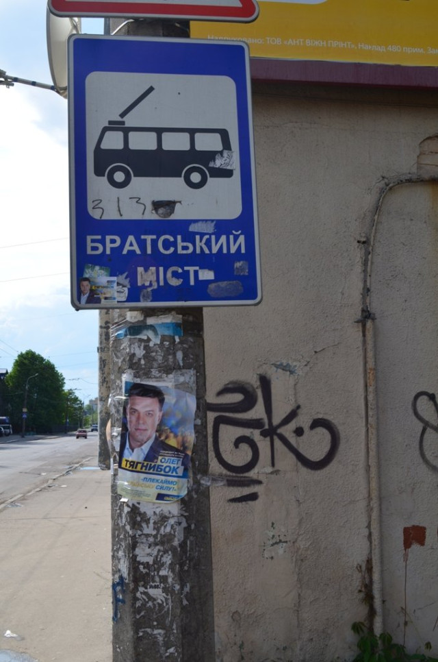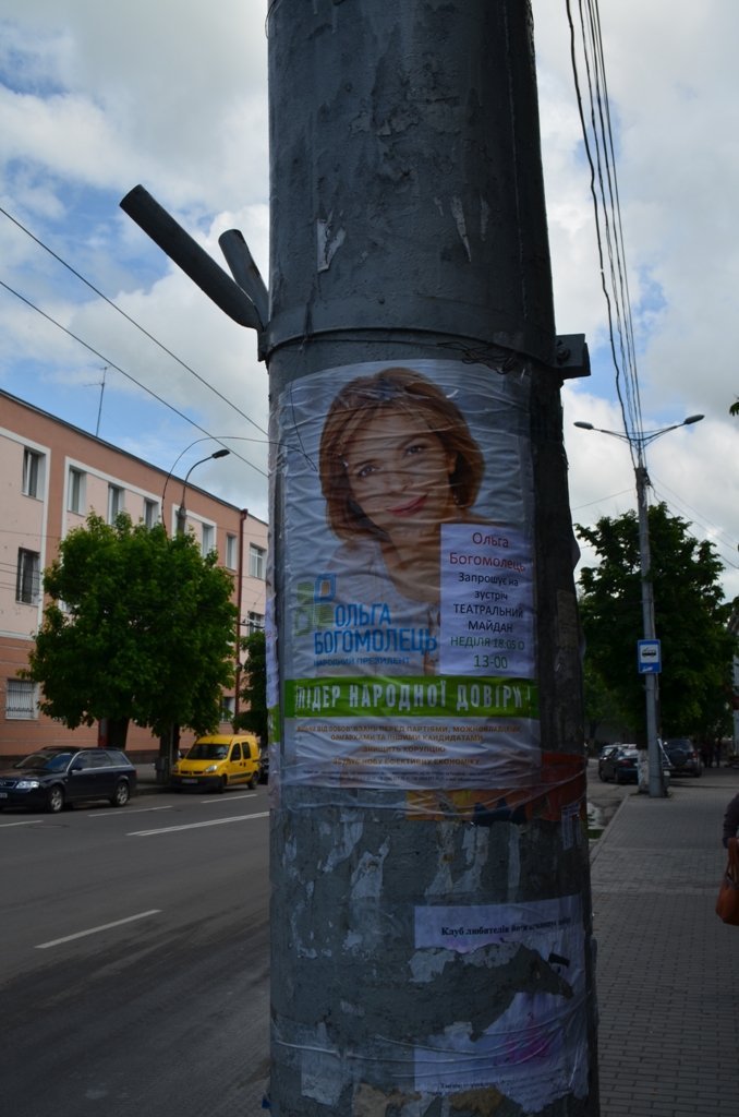Найбільш часто так здійснюють агітацію за свого кандидати агітатори виборчого штабу Олега Тягнибока. Плакати та наклейки із зображенням кандидата були розклеєні на стовпах електроопор та зупинках громадського транспорту в різних районах міста. Зокрема, 14 травня такі листівки були розміщені на зупинці «Братський міст». Масово обклеєно було місто «свободівською» агітацією й 9 травня. Тоді спостерігачі ОПОРИ фіксували випадки розміщення плакатів про приїзд до Луцька кандидата на пост Президента України Олега Тягнибока.Так само чинять й агітатори інших виборчих штабів. Зокрема, 17 травня, напередодні приїзду до Луцька кандидата на пост Президента України Ольги Богомолець, спостерігачі ОПОРИ зафіксували факти розміщення оголошень про її зустріч із виборцями на зупинках громадського транспорту та стовпах електроопор.