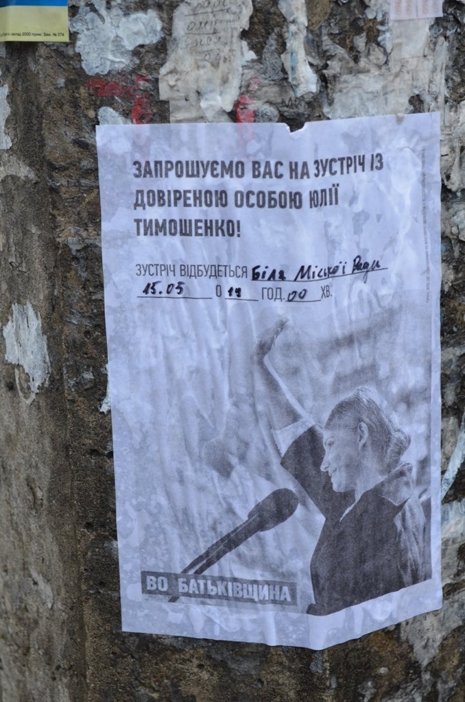 Листівки про зустрічі виборців з довіреною особою кандидата на пост Президента України Юлії Тимошенко теж розміщуються в неналежних місцях, зокрема стовпах, стінах будинків та зупинках громадського транспорту. 15 травня такими листівками, зокрема, був обклеєний район довкола міської ради. Раніше, ще в квітні, під час приїзду на Волинь кандидата на пост Президента України Петра Порошенка, оголошення про його зустріч із виборцями теж були розміщенні на стовпах та зупинках громадського транспорту.