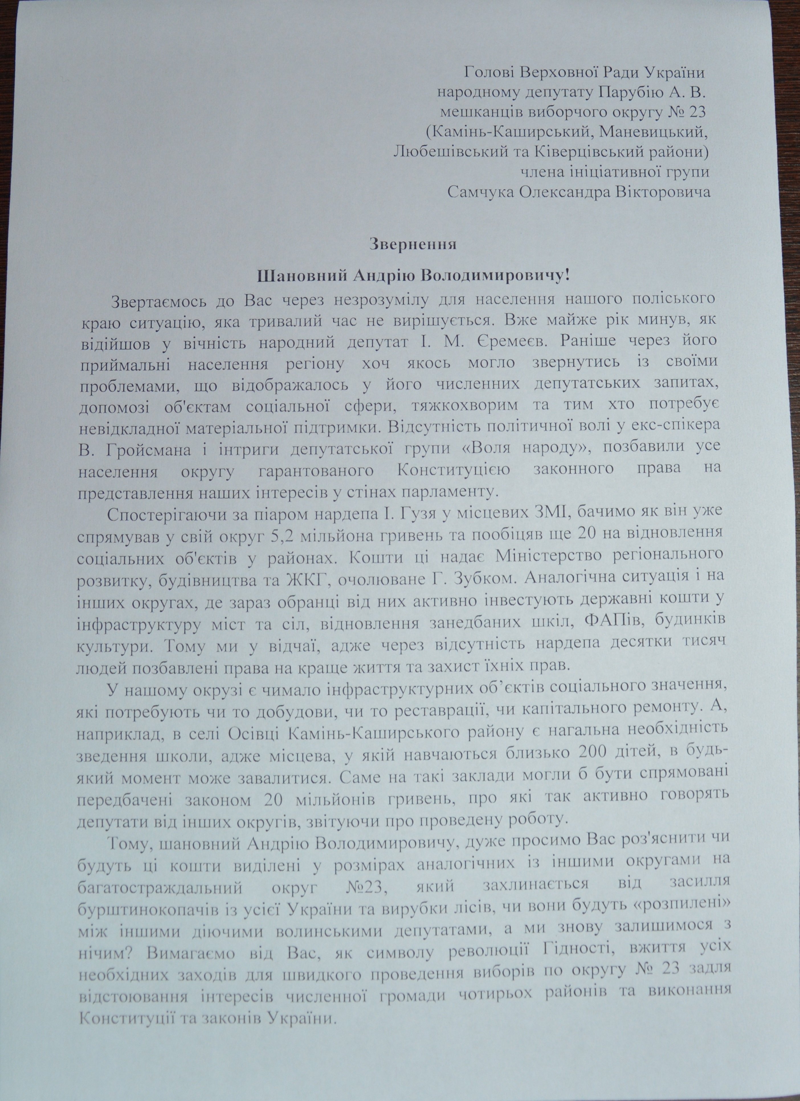«Тому, шановний Андрію Володимировичу, дуже просимо Вас роз’яснити, чи будуть ці кошти виділені у таких же обсягах, як і для інших округів, на багатостраждальний округ №23, який захлинається від засилля бурштинокопачів із усієї України та вирубки лісів, чи вони будуть «розпилені» між іншими діючими волинськими депутатами, а ми знову залишимося ні з чим. Вимагаємо від Вас, як символу революції Гідності, вжиття всіх заходів для швидкого проведення виборів в окрузі №23 задля відстоювання інтересів численної громади чотирьох районів та виконання Конституції й законів України», – йдеться наприкінці цього громадського документа. Вочевидь саме це звернення зокрема вплинуло на рішення нового голови ВР щодо прискорення розв’язання болючого питання. І рішення таки ухвалили: вибори відбудуться вже 17 липня.