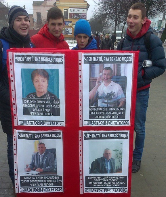 Головну площу Володимира-Волинського «прикрасила» дошкою ганьби. На ній розміщені фото членів Партії регіонів, які є депутатами Волинської обласної ради, Володимир-Волинської міської та районної рад. На фотографіях написано, що вони є «членами партії, яка вбиває людей» та те, що ці люди «залишаються з диктатором».
