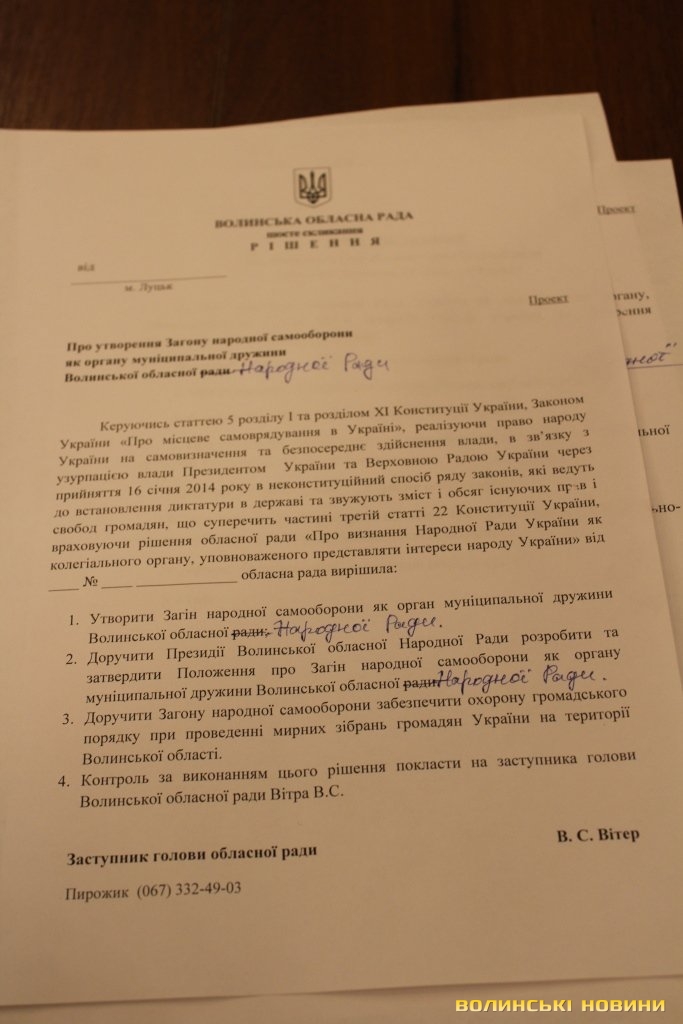 Як йдеться у рішенні ради, загони народної самооборони створили, реалізуючи право народу України на самовизначення та безпосереднє здійснення влади, в зв’язку з узурпацією Президентом України та Верховною Радою влади, шляхом прийняття в антиконституційний спосіб законів, що ведуть до встановлення диктатури в державі та звужують зміст та обсяг існуючих прав і свобод громадян. Загін забезпечуватиме правопорядок під час проведення мирних зібрань на території Волині.