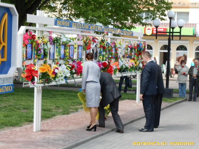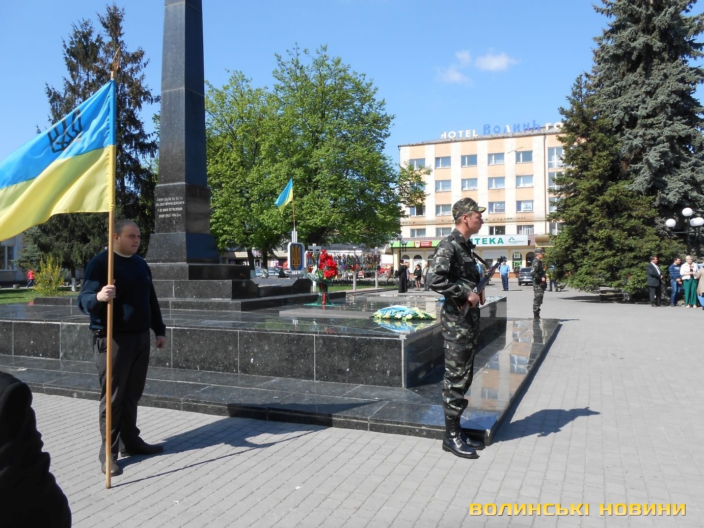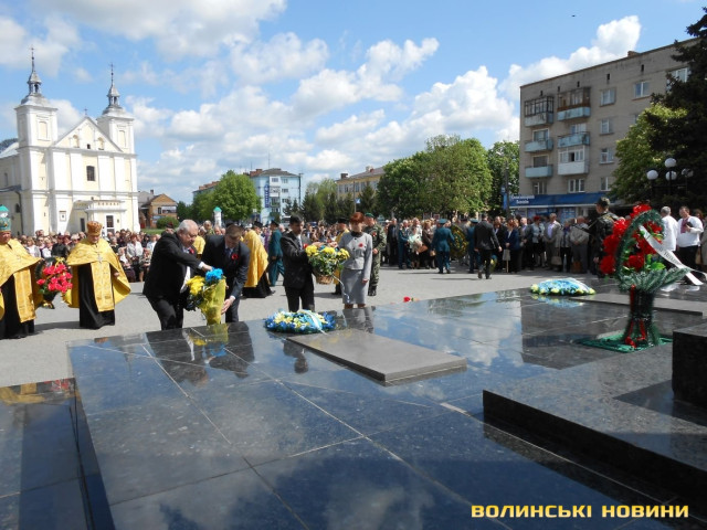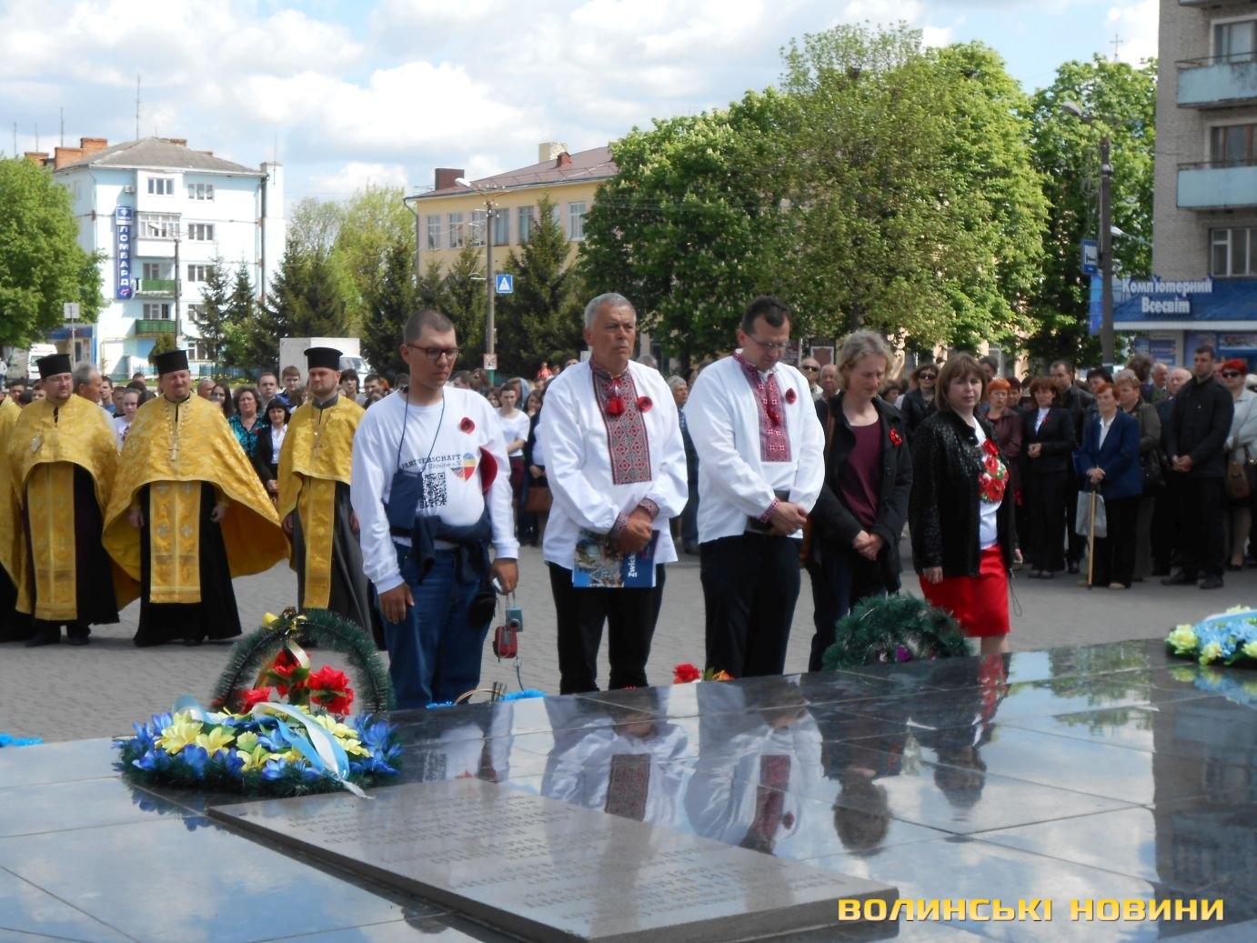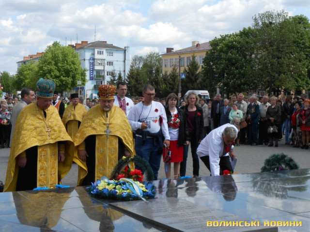 Після виступів, під тужливу фронтову «Степом, степом йшли солдати» до обеліска слави, де палав вічний вогонь, лягли квіти від влади, духовенства, ветеранів Другої світової, німецької делегації та жителів міста.Лягли квіти і до пам’ятної дошки зі світлинами жителів міста та району, які героїчно загинули у війні на сході України.