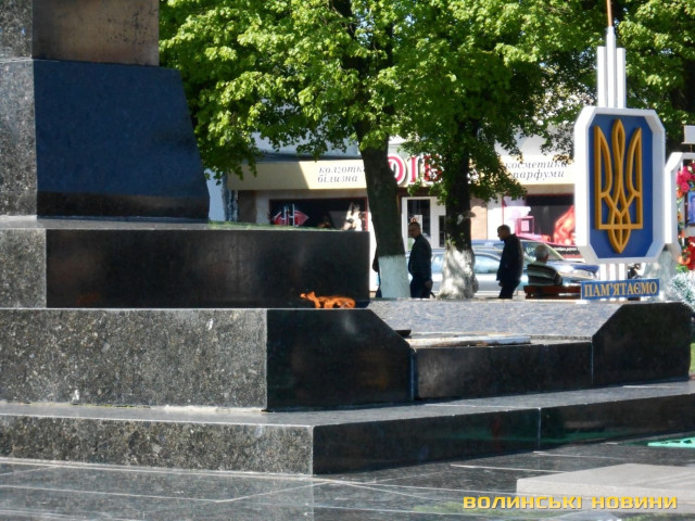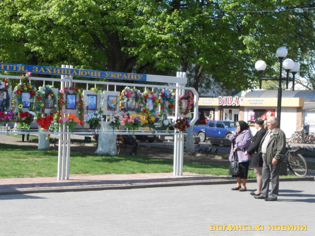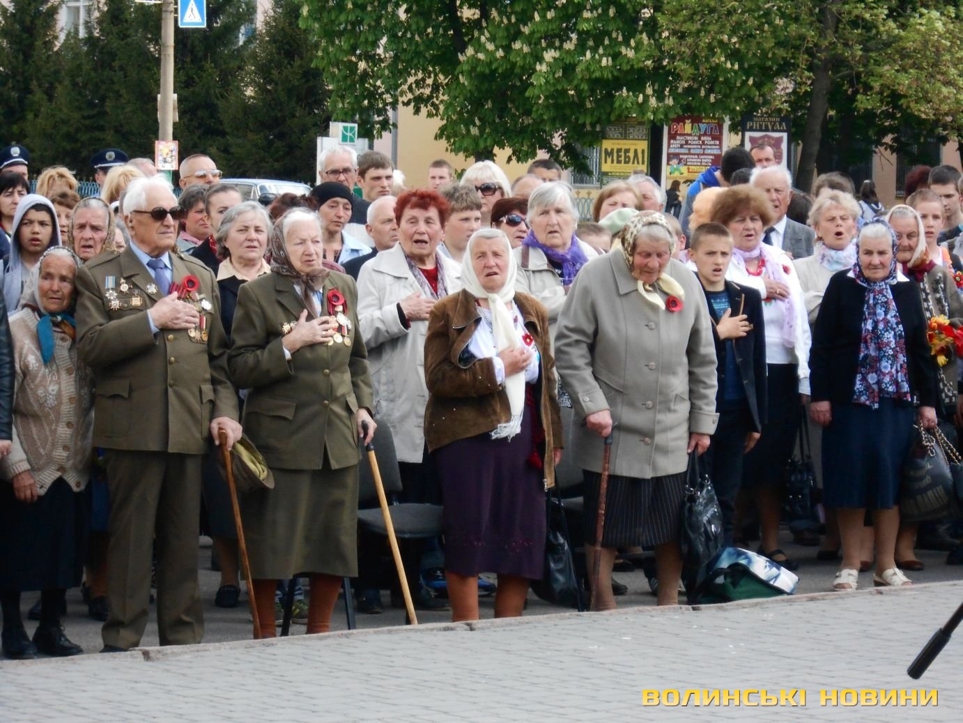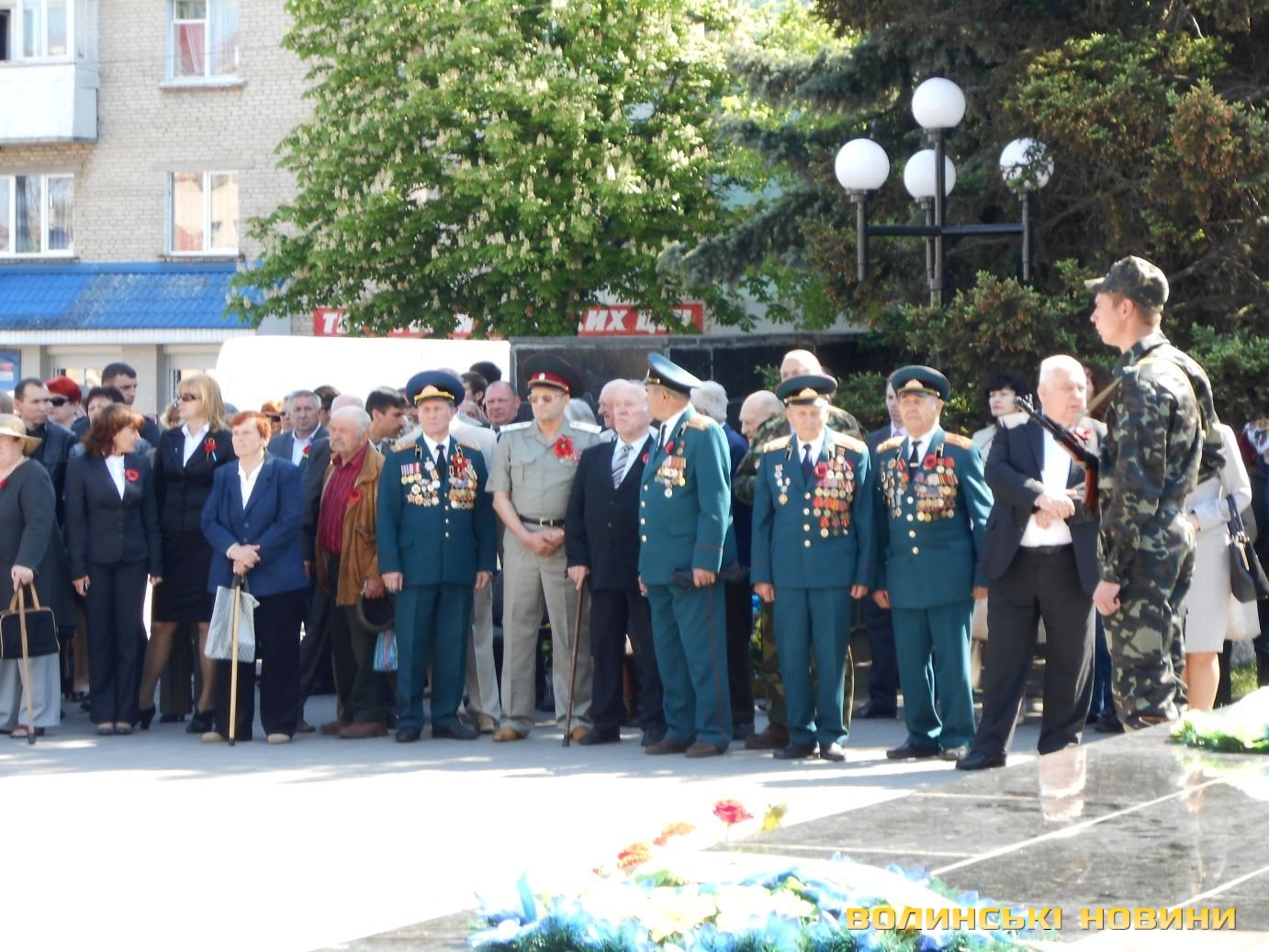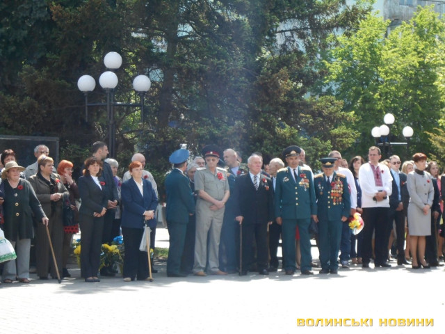 Після виступів, під тужливу фронтову «Степом, степом йшли солдати» до обеліска слави, де палав вічний вогонь, лягли квіти від влади, духовенства, ветеранів Другої світової, німецької делегації та жителів міста.Лягли квіти і до пам’ятної дошки зі світлинами жителів міста та району, які героїчно загинули у війні на сході України.
