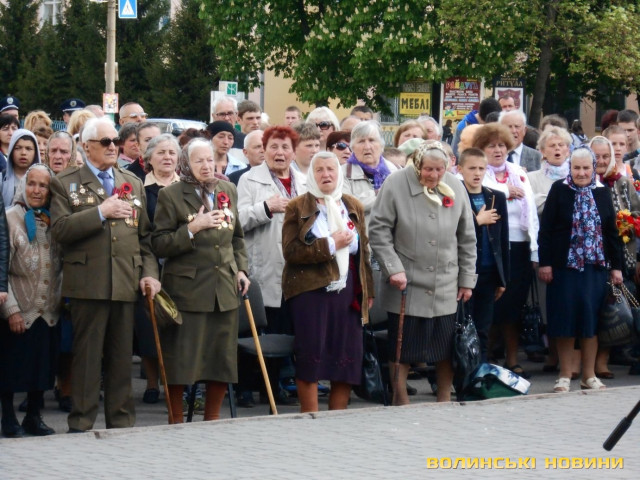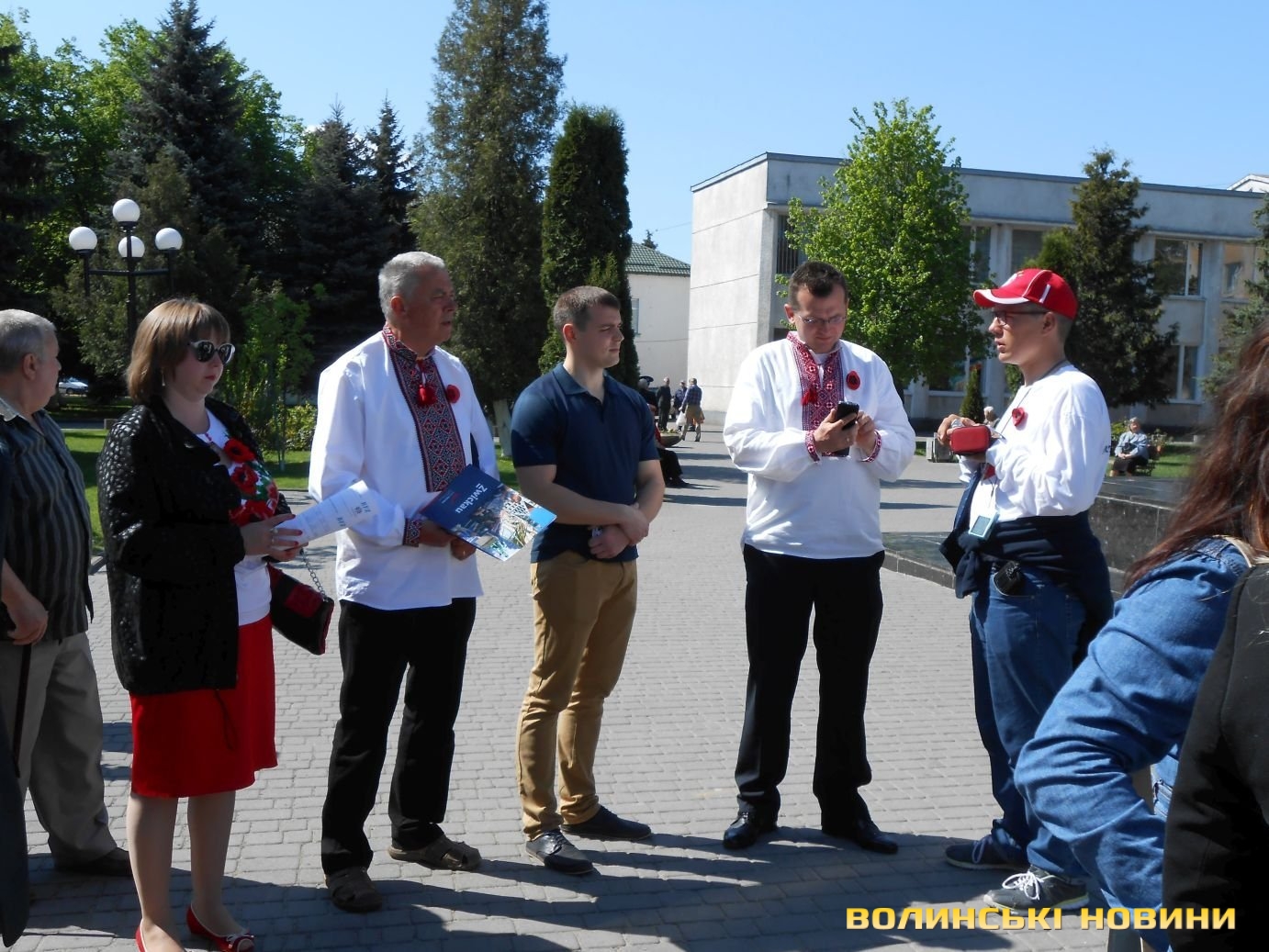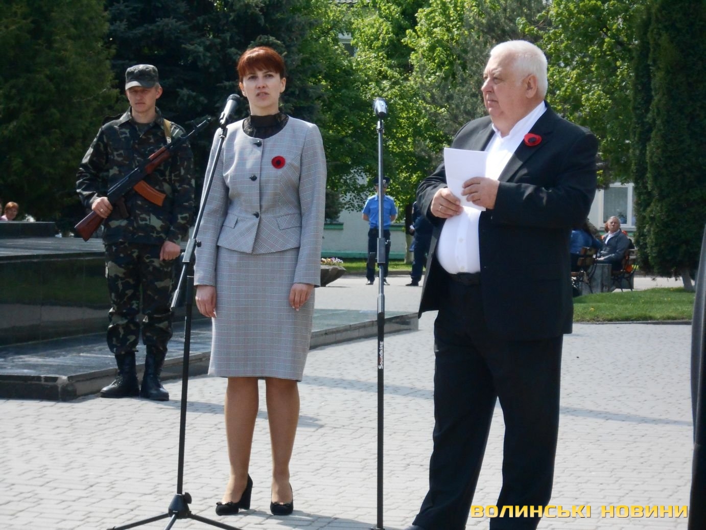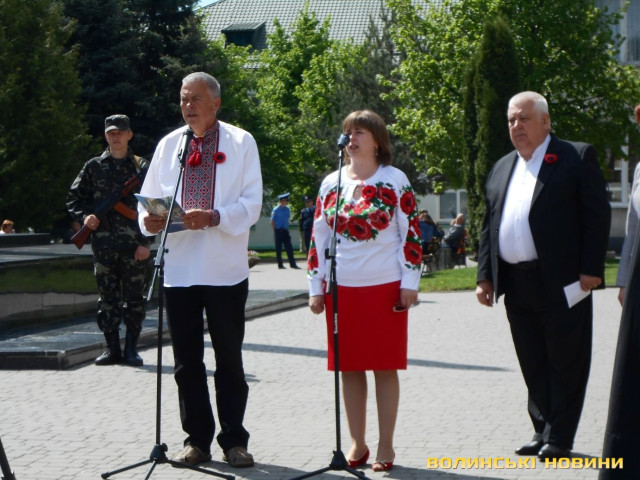 «Маки, які майорять на грудях, – це наша відповідь на георгіївську стрічку, як символ смерті та крові, який ніколи не дасть нам забути страшної трагедії», - зазначила у своєму виступі голова Володимир-Волинської РДА Наталія Василець і закликала єднатися та спільно боротися проти ворога на сході країни.Зворушливим моментом став виступ депутата німецького міста Цвікау Карла-Ернста Мюллера, який у складі делегації прибув до Володимира-Волинського. Карл-Ернс вже десять років їздить на Волинь на могилу свого дядька, який загинув у перші дні нападу Німеччини на Радянський Союз: