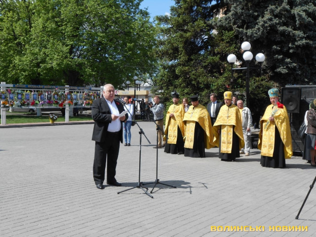 Коли Гітлер напав на Чехію, весь світ був стурбований, але казав, що їх це не стосується, так само весь світ казав, коли поділили Польщу і підписали акт про ненапад. Сьогодні, коли брат, сусід напав на нашу державу, знову кажемо, - нас це не стосується. Стосується кожного, і тих, хто пережив війну, і тих, хто її переживає нині! Нехай пам'ять сердець згуртує нас в єдиній боротьбі за нашу державу та наш український народ».Не оминув у своєму виступі небажання священиків Московського патріархату долучитися до спільної молитви, і мер Володимира-Волинського Петро Саганюк:«Сьогодні такі панахиди проходять по усій нашій державі та області, але, мабуть, тільки в нашому місті духовенство не може помиритися. Я хотів би, і моя громада хотіла, щоб ви жили дружно і мирно, а не один перед одним бігли».