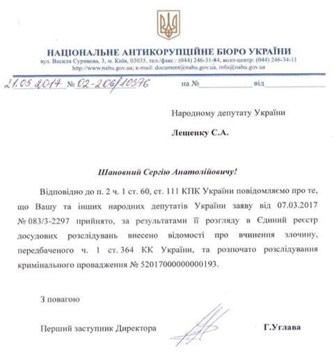 У НАБУ уточнили, що до Єдиного реєстру досудових рішень внесено відомості про вчинення злочину, передбаченого ч.1 ст.364 Кримінального кодексу України, та розпочато кримінальне провадження. Про це інформує «Українська правда».Нагадаємо, у скарзі нардепів до НАБУ йшлося, що голова суду Шереметьєва не виконала свої посадові обов'язки – не призначила чергового суддю для розгляду клопотання захисту Насірова про відвід судді Олександра Бобровника, який вів засідання про обрання запобіжного заходу відстороненому голові ДФС Насірову.