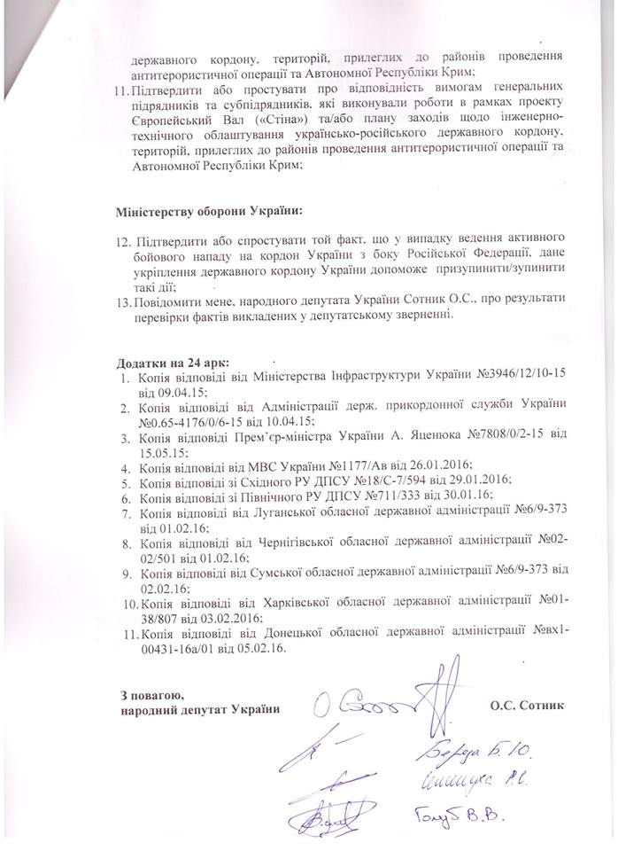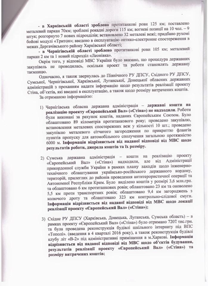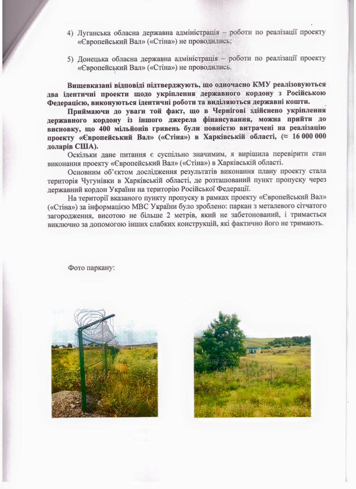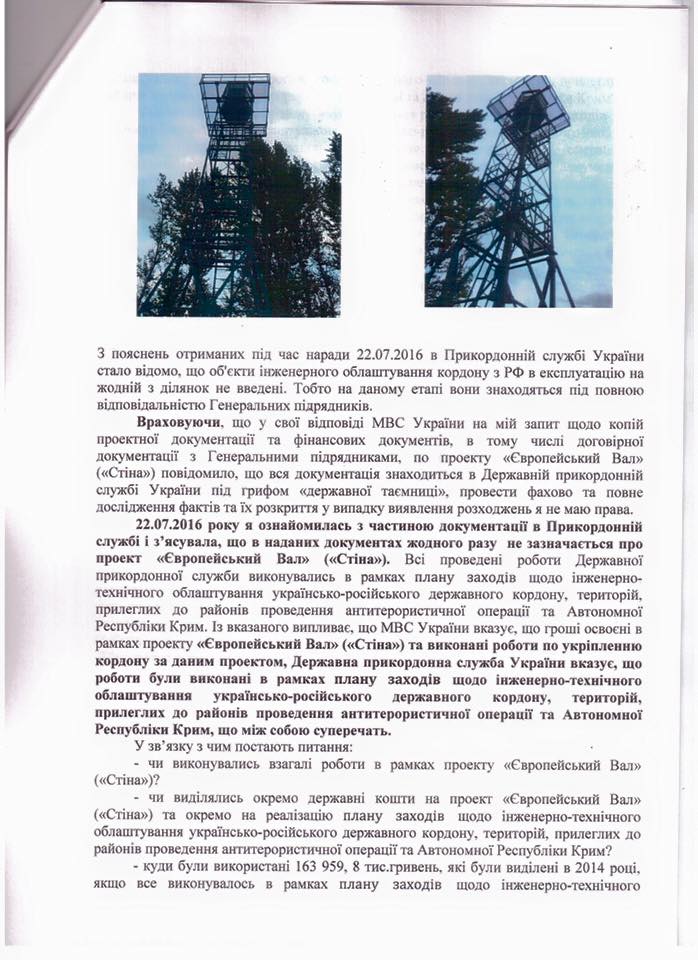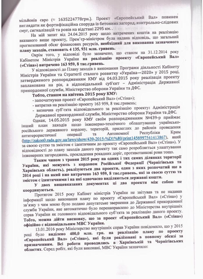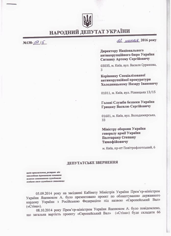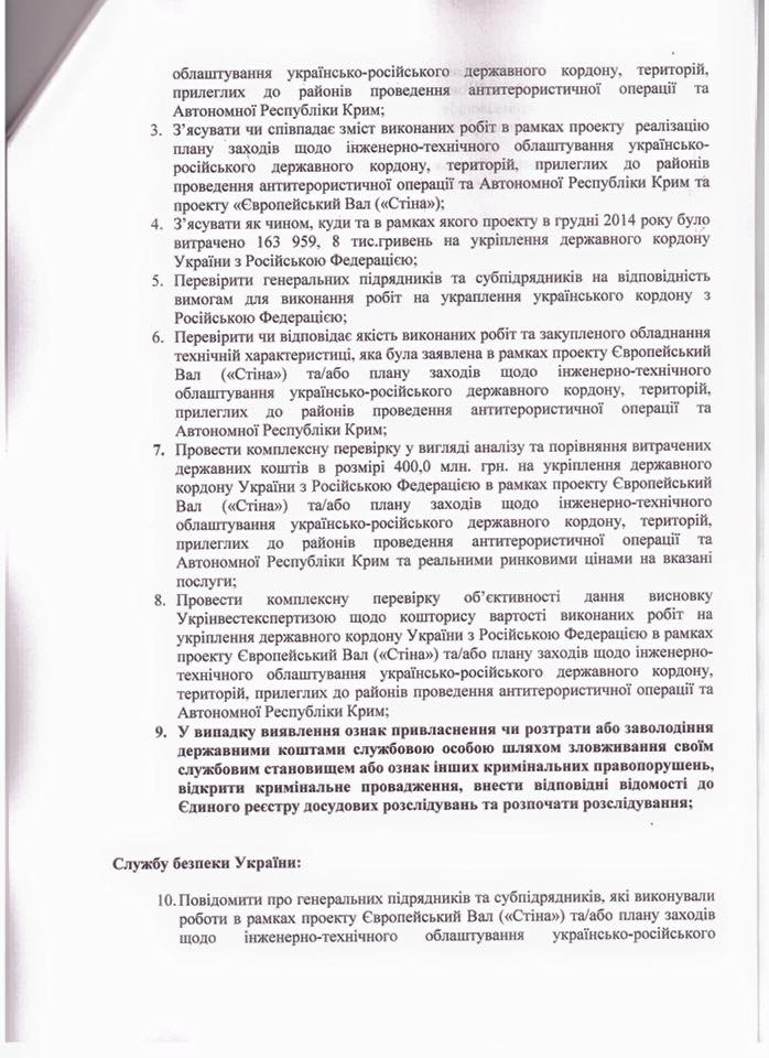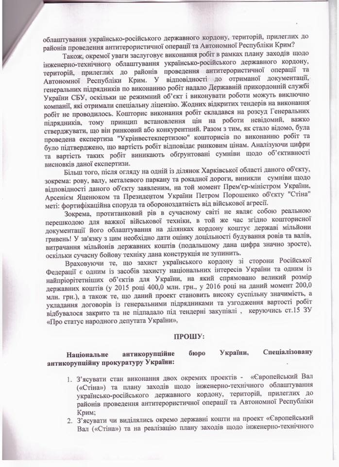 Народні депутати України вимагають від Національного антикорупційного бюро, Спеціалізованої антикорупційної прокуратури, Служби безпеки України та Міністерства оборони вивчити питання щодо виділення бюджетних коштів на виконання проектів «Європейський вал» («Стіна») та інженерно-технічного облаштування українсько-російського державного кордону, територій, прилеглих до районів проведення антитерористичної операції та Автономної Республіки Крим.