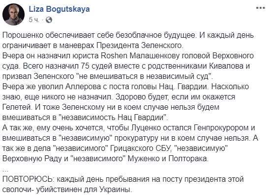Повторюся: кожен день перебування на посту президента цієї сволочі – вбивчий для України », – пише активістка Ліза Богуцька.