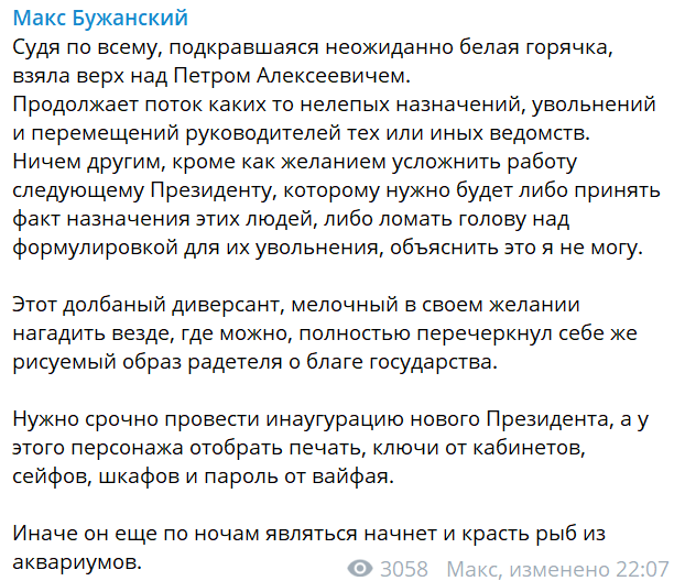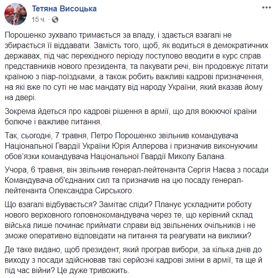 «Порошенко зухвало тримається за владу, і здається взагалі не збирається її віддавати. Замість того, щоб, як водиться в демократичних державах, під час перехідного періоду поступово вводити в курс справ представників нового президента та пакувати речі, він продовжує літати країною з піар-поїздками, а також робить важливі кадрові призначення, на які вже, по суті, не має мандата від народу України, який вказав йому на двері. ...