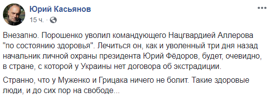 «Раптово. Порошенко звільнив командувача Нацгвардією Аллерова «за станом здоров’я». Лікуватися він, як і звільнений три дні тому начальник особистої охорони президента Юрій Федоров, буде, очевидно, в країні, з якою в України немає договору про екстрадицію.
