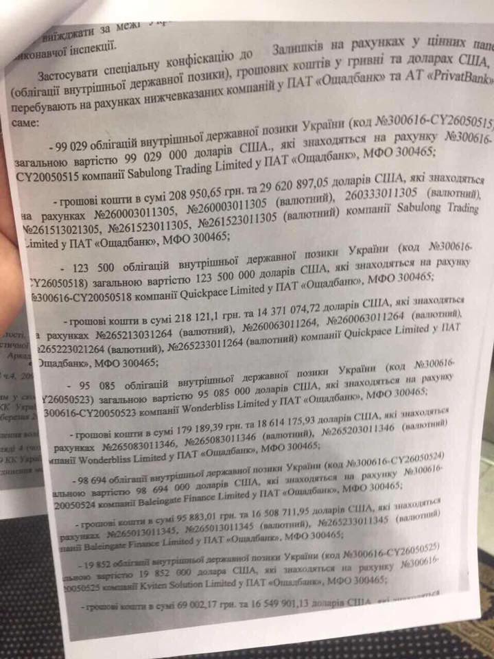 Генпрокурор Юрій Луценко з приводу спецконфіскації цієї величезної суми скликав спеціальний брифінг. Там він описав і схему, по якій ці кошти, "вкрадені Януковичем і членами його команди", були легалізовані. Спочатку вони виводилися з України на Кіпр або в Латвію, а звідти заводилися назад в Україну, де за ці кошти купувалися держоблігації. При цьому рішення про випуск облігацій брали соратники Януковича, яких слідство також віднесло до членів його злочинного угруповання.