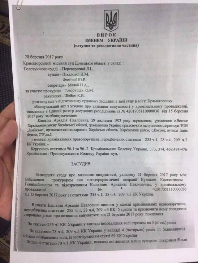 - Чому суд в Краматорську? Слідчі ГПУ відмовилися брати участь. Прокурор Кулик, з яким Кашкін уклав угоду? Так на ньому клейма ніде ставити. Він висить на гачку кримінальних справ. Рішення нікому не показали. Знайшли якогось наркомана, який дав цікаві свідчення. В результаті бюджет заплатить двічі. Зараз в кишеню цим, а після рішення судів - в кишеню тим".