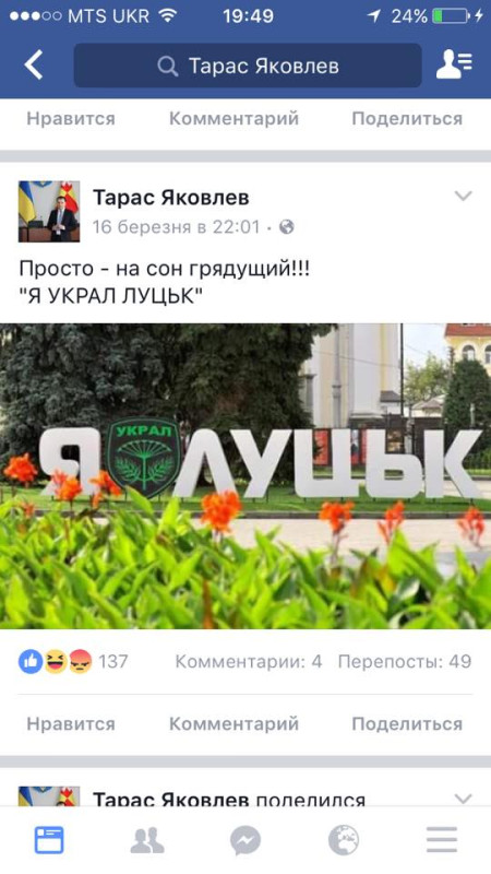 Думаю, що більшість мешканців міста оцінили пост Тараса Яковлева в фейсбуці із відповідним зображенням, що на фото нижче.
