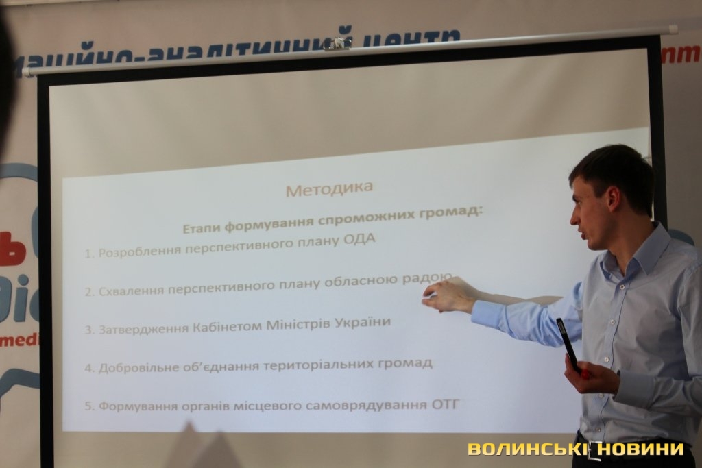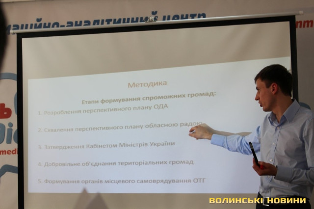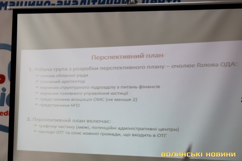 До кінця місяця має бути затверджена методика формування спроможних громад. До робочої групи з розробки перспективного плану окрім голів облради та ОДА та представників неурядових організацій повинен входити головний архітектор та представник підрозділу з питань фінансів. У результаті повинна бути отримана графічна частина (нова мапа Волині) та описова частина (паспорт області з описом показників за кожним населеним пунктом та громадою). Визначатимуться центри економічного впливу (найбільш спроможні громади). Відповідно до методики, центрами ОТГ перш за все мають стати міста обласного значення, потім – чинні центри районів, міста районного значення та найбільш спроможні та забезпечені інфраструктурою територіальні громади (селища та села). На новій мапі не може бути сірих чи білих плям – поза ОТГ не може залишитися жодне найменше село.