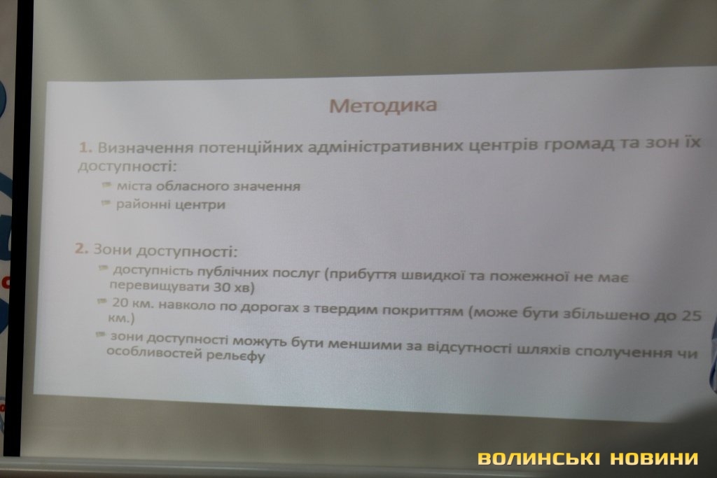 Визначатимуть зону доступності кожного потенційного центру об’єднаної територіальної громади (наприклад, одним з таких центрів на Волині може бути Володимир-Волинський), 20-кілометрову зону впливу, яка може розширюватися чи зменшуватися у межах 15-25 кілометрів від центру. Якщо якісь населені пункти не потраплятимуть у зони впливу центрів, братимуть до уваги чинні районні центри. У перспективі на мапі Волині нанесуть межі ОТГ.