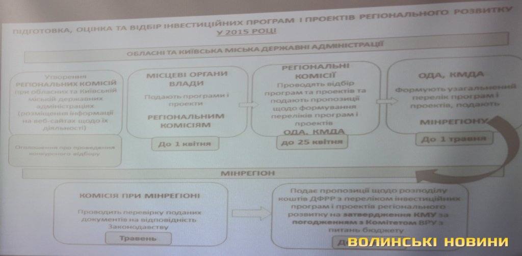 Він нагадав, що в бюджет 2015 року заклали три мільярди гривень у фонд регіонального розвитку, які мають бути розподілені вже з квітня. Закон «Про засади державної регіональної політики» запровадив нову модель фінансування регіональних проектів, передбачив введення державної стратегії та механізм прозорого відбору проектів для фінансування на рівні регіонів. Так, передбачено, що на рівні обласних адміністрацій повинні бути утворені регіональні комісії з відбору проектів. До комісій повинні увійти представники органів місцевого самоврядування, неурядових організацій, голови ОДА та облради, профільні асоціації органів місцевого самоврядування.