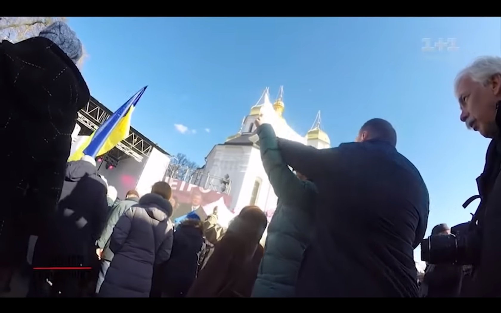 Начальник управління місцевого СБУ Олексій Кутовий вирвав з рук журналіста Євгена Куксина плакат під час візиту Петра Порошенка до Чернігова.