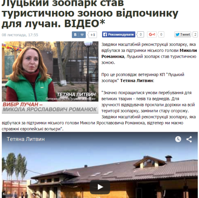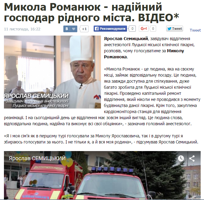 В обласному центрі Волинської області кандидат на посаду Луцького міського голови від політичної партії «Блок Петра Порошенка «Солідарність» Микола Романюк протягом виборчого процесу з виборів 15 листопада здійснював агітацію з використанням адміністративного ресурсу.Зокрема, ветеринар комунального підприємства «Луцький зоопарк» Тетяна Литвин, завідувач відділення анестезіології Луцької міської клінічної лікарні Ярослав Семицький закликали голосувати за Миколу Романюка у відеороликах, які поширювались в інтернет-виданнях та на місцевих телеканалах з позначкою «Політична реклама».