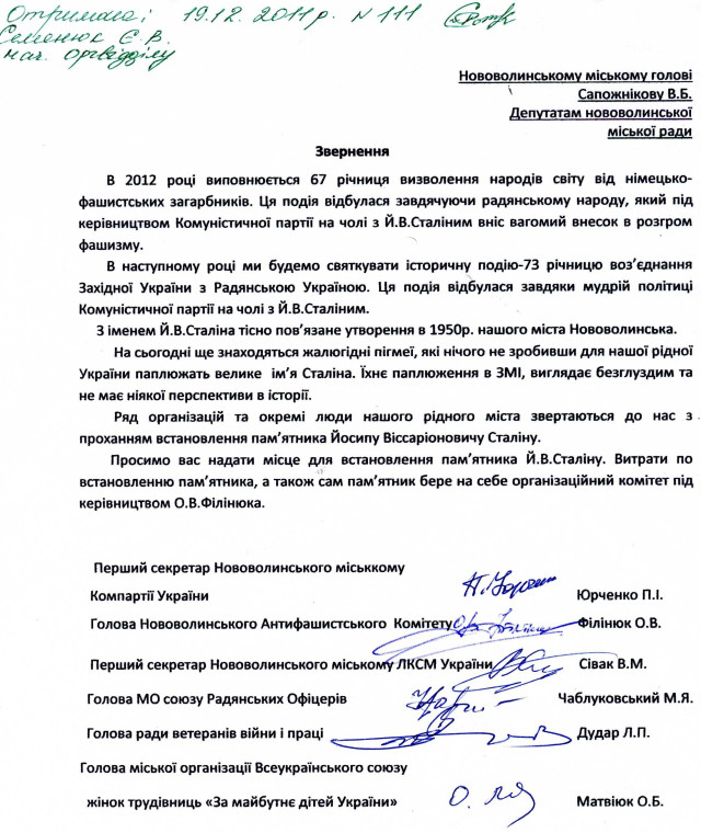 «Просимо вас надати місце для встановлення пам’ятника Й.В. Сталіну. Витрати по встановленню пам’ятника, а також сам пам’ятник бере на себе організаційний комітет під керінвицтвом О.В.Філінюка (голови міського осередку Антифашистського комітету, - «ВН»)», - зазначають підписанти.