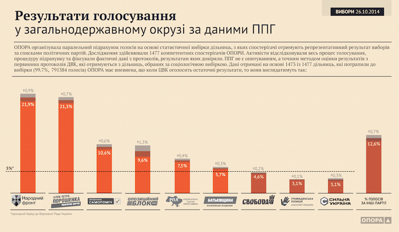 Громадянська мережа «ОПОРА» оприлюднила результати паралельного підрахунку голосів. Згідно з результатами, до парламенту проходять 6 партій.