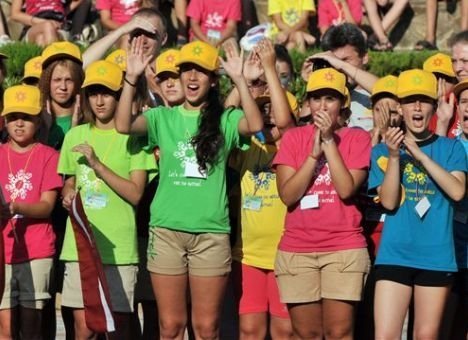 Дітей стали заводити на стадіон приблизно об 11:00. Всіх охорона провела через рамку металодетектору. Діти одягнені в артеківську форму та бейсболки, у всіх в руках невеликі пляшечки з водою. Викрикують табірні кричалки.