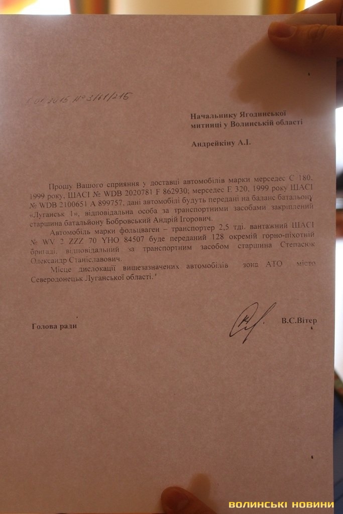 Однак, народні обранці не могли полишити автомобільну тематику, тому «залишивши у спокої» Тросне, знову почали вести мову про авто. Цього разу вони оприлюднили лист Валентина Вітера до начальника Волинської митниці Андрія Андрейківа, у якому посадовець просив головного митника посприяти у розмитненні трьох машин - Мercedes С 180, МercedesF 320, а також Volkswagen Transporter. У листі йшлося про те, що усі ці авто будуть доставлені у зону АТО на потреби батальйону Луганськ–1 та 128-ої окремої гірсько-піхотної бригади.І все б нічого, але усі три автомобілі не годяться для роботи у зоні бойових дій, бо є задньопривідними. Варто зазначити, що автомобілі з переднім приводом простіші в збірці, тому їх вартість нижча в порівнянні з аналогічними моделями з заднім приводом. Передньопривідні машини на прямолінійній траєкторії мають більш високу курсову стійкість. Задньопривідні автомобілі мають менший радіус розвороту і є більш маневреними. Задньопривідні машини важчі , але вага по осях у них розподілений більш рівномірно, що істотно поліпшує керованість автомобіля. У салонах задньопривідних автомобілів менше відчувається вібрація двигуна.Задній привід характерний для більшості автомобілів преміум класу.«Такими авто дуже складно їздити в зимовий період. Та й жодний з командирів не підтвердив, що такі авто можуть згодитися у зоні АТО. Вони обурились, що їх ім’я використовують для злочинних дій. Ми звернемось до правоохоронних органів, аби з’ясувати, хто такі ці особи – Бобровський та Степасюк, про яких говориться у листі, бо батальйон заперечує, що в його складі є такі прізвища. Криміналу ніби й немає, але чи має право людина, яка, користуючись АТО, завозить собі мерседеси на територію України. Автомобільна тематика є присутня в діяльності голови облради протягом тривалого часу, і вона не сходить з його рук», - каже Олександр Свирида.