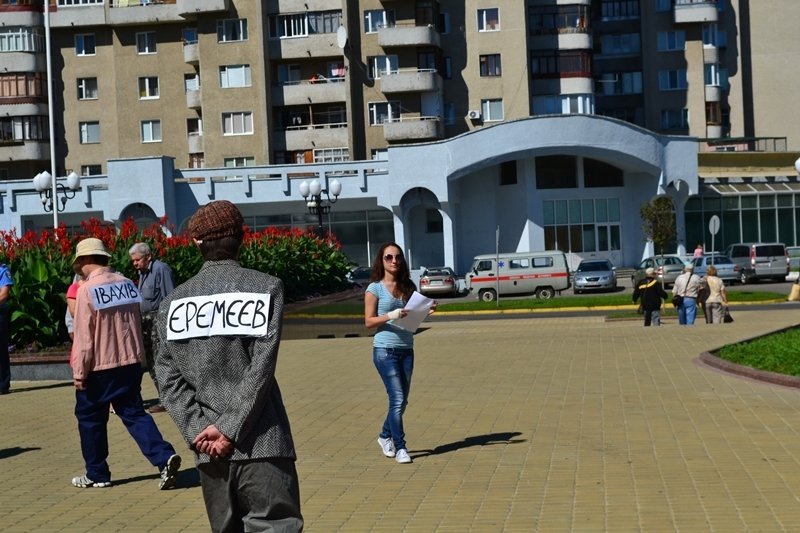 Приблизно в 11 годині біля будівлі ОДА розпочалася акція. Зокрема, семеро молодих хлопців у лахмітті та з наклейками на спинах, на яких було зазначено «Івахів», «Єремеєв», «Смітюх», «Голєв», «Козюра», а також з табличкою «Благодійний фонд «Рідна Волинь» ходили по колу, ніби в хороводі, і говорили: «Боря не дої». А в центр кидали купюри доларів та гривень. Дівчина в той час роздавала перехожим листівки.