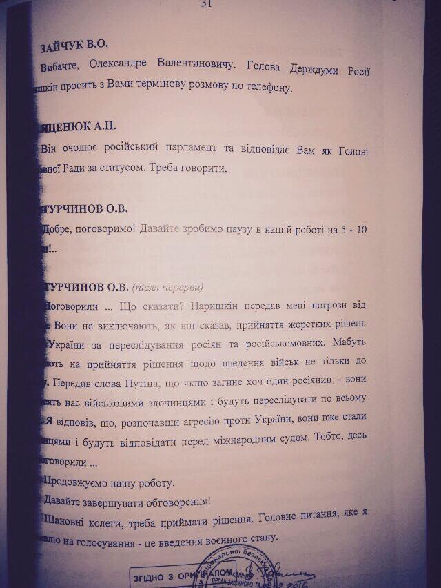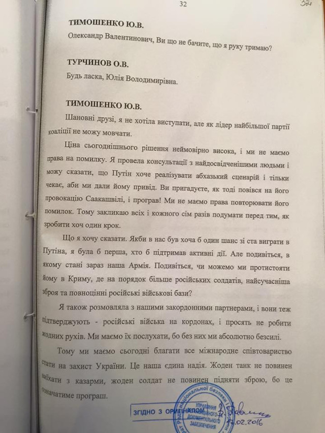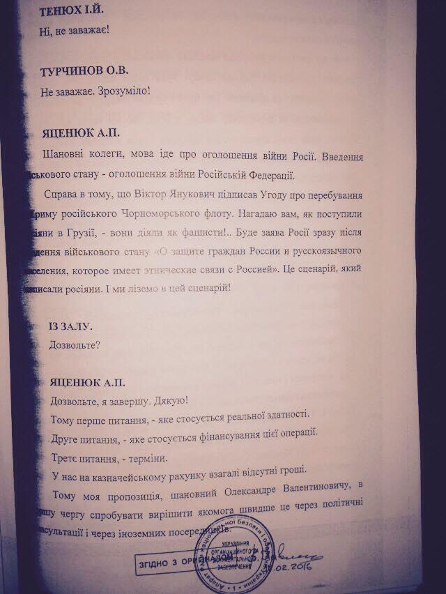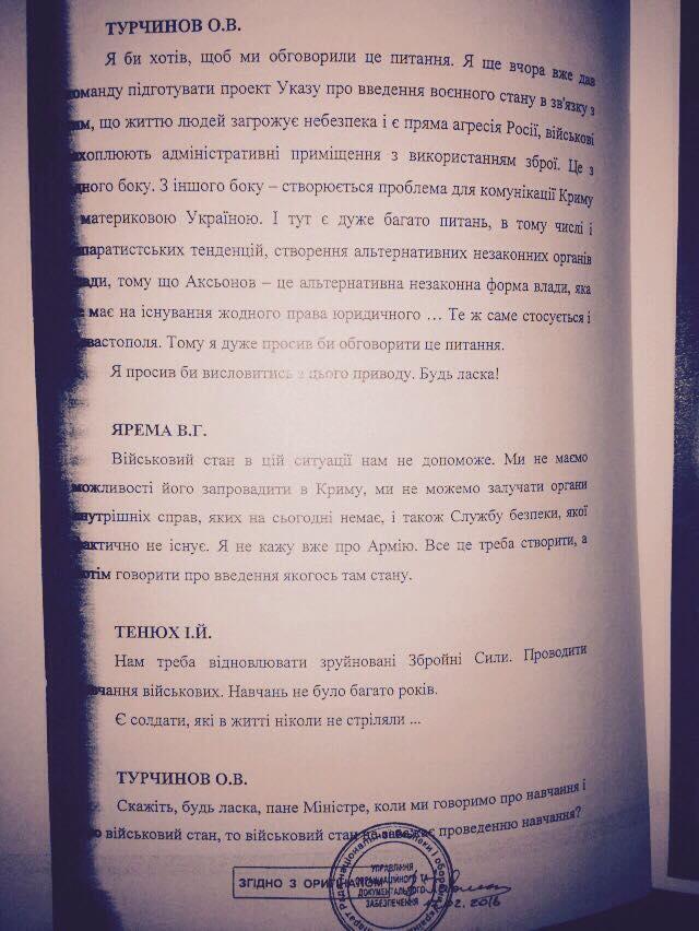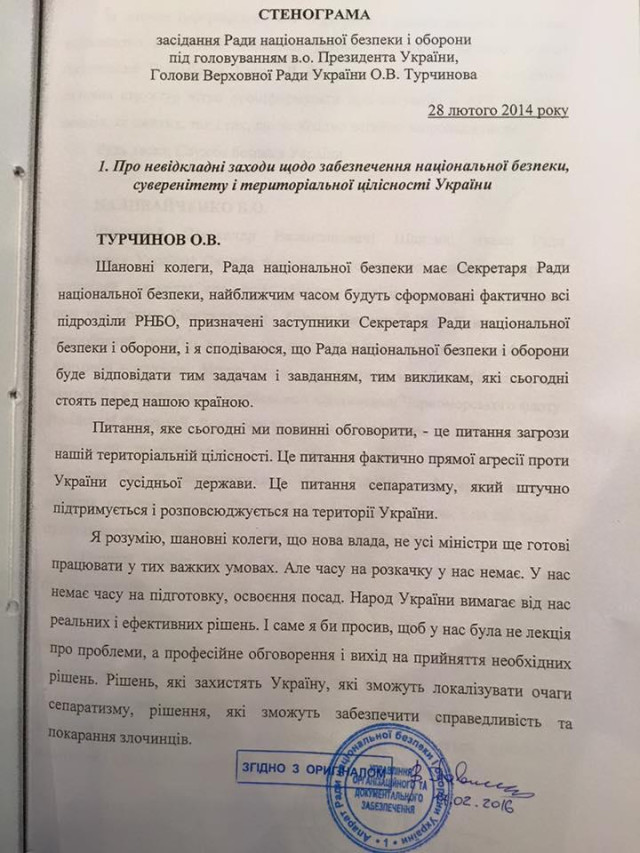 Стала доступною для громадськості стенограма засідання РНБО від 28.02.14 р. після активізації російських військ у Криму, на якому вирішувалося питання введення воєнного стану в Україні.