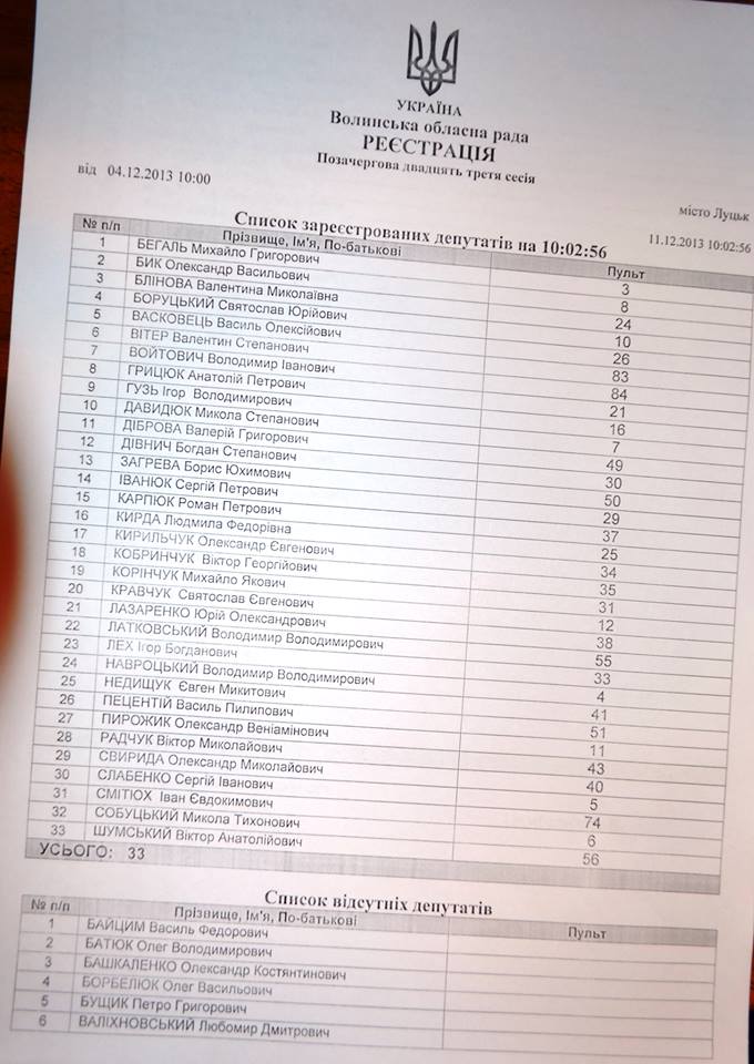 Подаємо списки присутніх та відсутніх депутатів Волинської облради. Фото в мережі виклала активістка луцького Євромайдану Юлія Грищук.