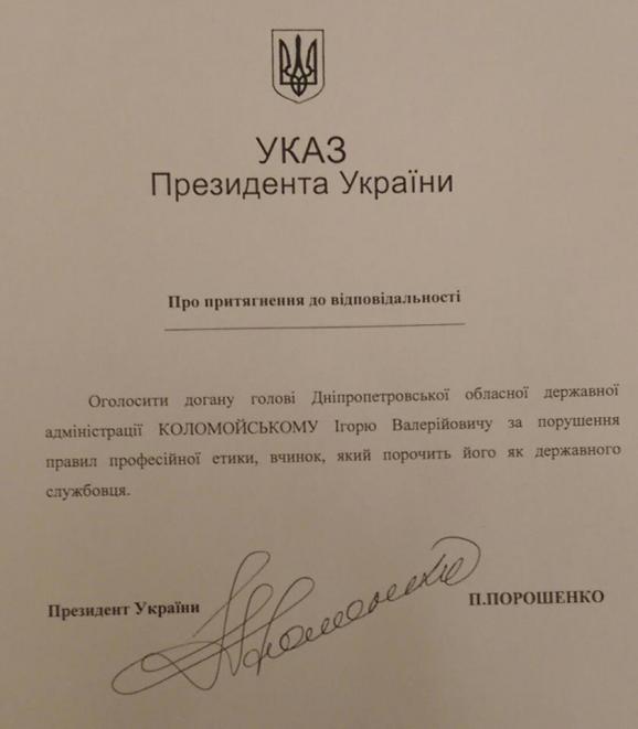 Нагадаємо, готується указ про звільнення Коломойського з посади голови Дніпропетровської ОДА.