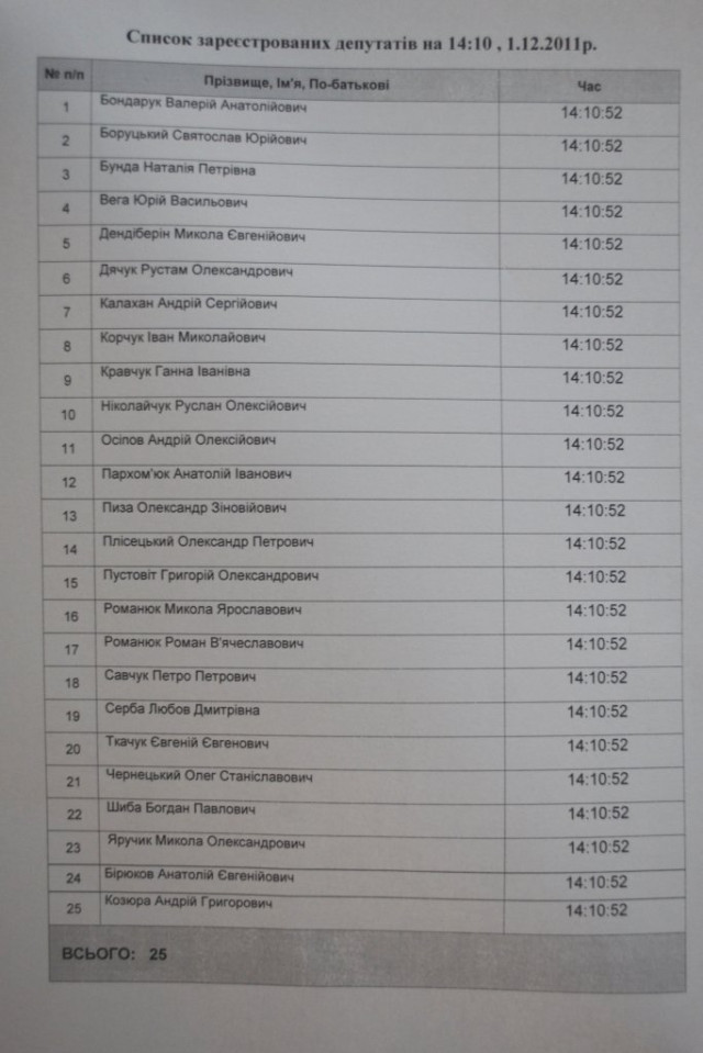 Проте після оголошеної перерви, яка мала завершитися о 14.00, обранці луцької громади до сесійної зали чомусь не дійшли. Так, станом на 14.10 зареєструвалися аж 25 депутатів із півсотні. Тому сесію визнано нелегітимною, адже для роботи сесії потрібно принаймні 27 «голосів».