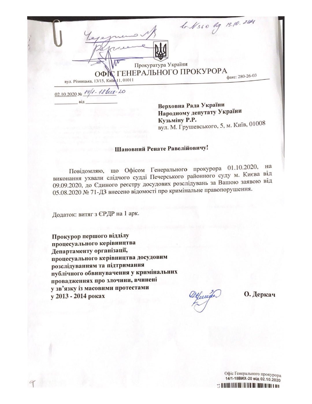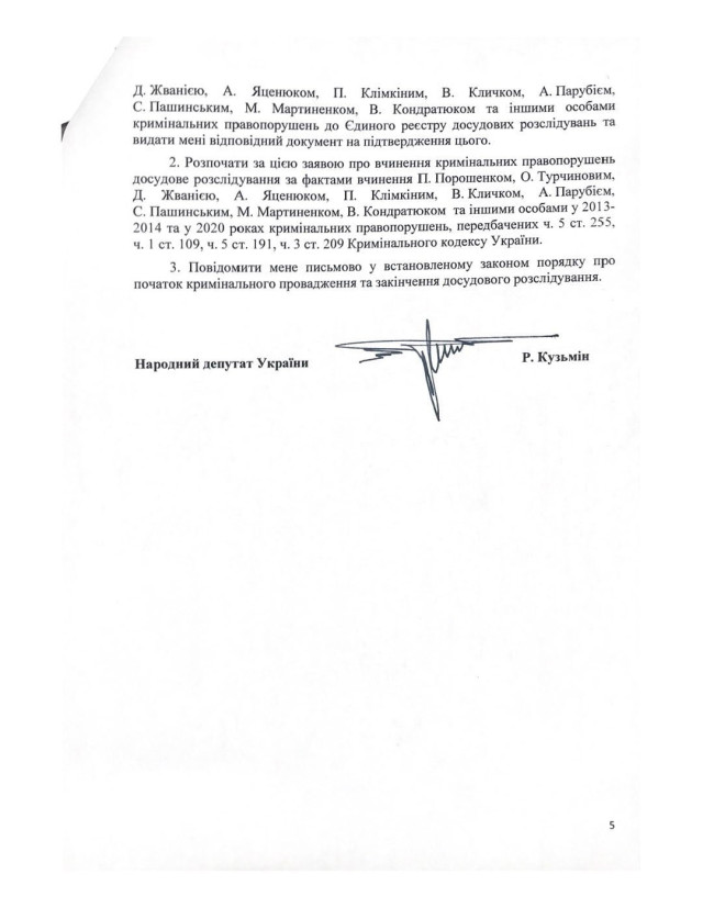 Крім того, до своєї заяви депутат додав копії відповіді Офісу генпрокурора на його запит з інформацією про порушення справи 1 жовтня, а також копію виписки з ЕРДР, в якому названі прізвища колишніх представників влади і дати можливого скоєння злочинів.