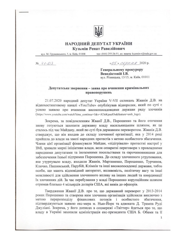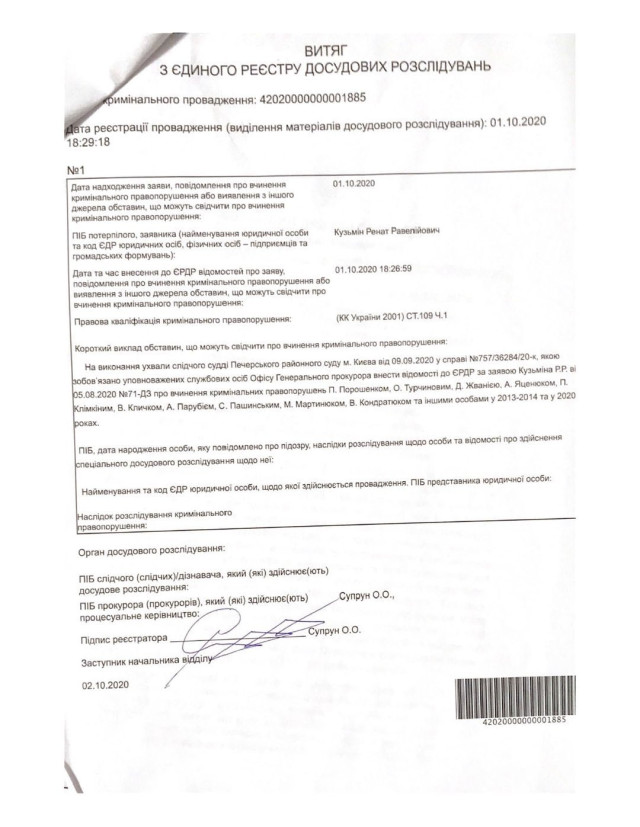 «Публікую документи про реєстрацію в ЕРДР (Єдиний реєстр досудових розслідувань України) і початок розслідування за фактами незаконного захоплення державної влади, широкомасштабних розкрадань і легалізації «брудних» грошей організованою злочинною групою ...» – написав Кузьмін.