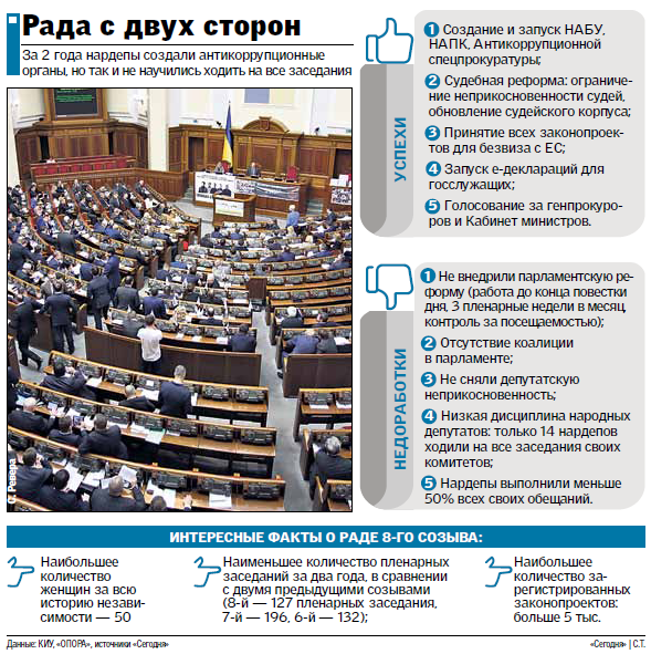 Сьогодні виповнюється два роки з того моменту, як нинішнє скликання Верховної Ради вперше зібралося в залі пленарних засідань. За половину відведеного законом 4-річного терміну нинішні нардепи встигли зареєструвати рекордну кількість законопроектів, вирішити питання судової реформи, але й стати одним з найбільш нехлюйських парламентів України, - повідомляє "Сегодня".