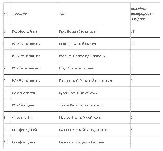 Нижче опинилися група депутатів із 6-ма пропущеними засіданнями, до якої ввійшли представники різних фракцій. Тож, із 5 сформованих у раді фракцій, лідерську позицію за невідвідуваністю депутатами засідань посідає ВО «Батьківщина».