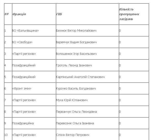 Із 62-ох депутатів районної ради є й такі, які сумлінно відвідують усі засідання. Без жодного «прогулу» провели рік депутати: Віктор Бехнюк, Тетяна Тирилюк, Тамара Фрасоля (ВО «Батьківщина»); «свободівець» Вадим Веремчук, депутати фракції Партії регіонів Юрій Муха, Ольга Перванчук, Віктор Сіліхін та голова ради Ігор Волошенюк; «Фронту змін» – Василь Курочко та Ігор Члек, а також позафракційні Леонід Гроголь, Анатолій Карпінський та Ольга Перевознік.