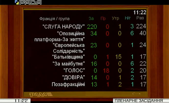 «320 за. Рішення прийнято. Закон прийнятий в цілому», – виголосив спікер Ради Дмитро Разумков.Проти підтримання проєкту закону № 2569 Про внесення зміни до статті 1 закону України «Про особливий порядок місцевого самоврядування в окремих районах Донецької та Луганської областей» проголосувала фракція «Голосу».