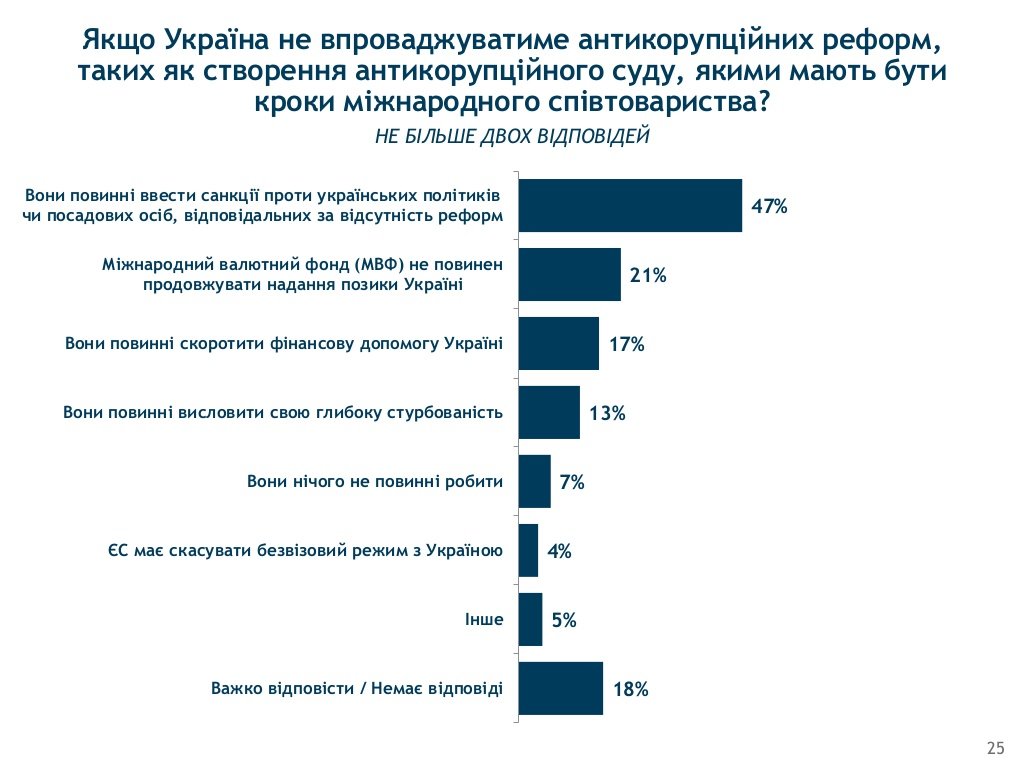 Про це пише Дзеркало тижня.Таку оцінку прокоментував на своїй сторінці у Фейсбуці політик Андрій Портнов.Відповідаючи на питання, якими мають бути кроки міжнародного співтовариства, якщо Україна не буде проводити антикорупційних реформ, таких як створення антикорупційного суду, 47% українців схвалили санкції проти українських політиків чи посадовців, відповідальних за відсутність реформ.