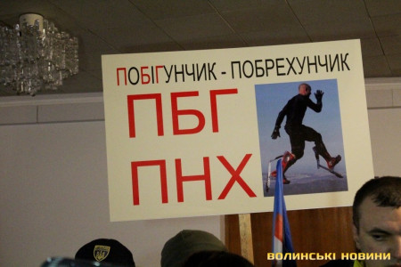 Юрба активістів пройшла в будівлю, де в коридорі перед дверима приймальні голови ОДА представники громади спілкувалися з Володимиром Гунчиком. На початку зустрічі він закликав усіх вшанувати загиблих торік на Майдані хвилиною мовчання. До слова, хтось з учасників акції приніс із собою банер із написом «Побігунчик-побрехунчик ПБГ ПНХ».