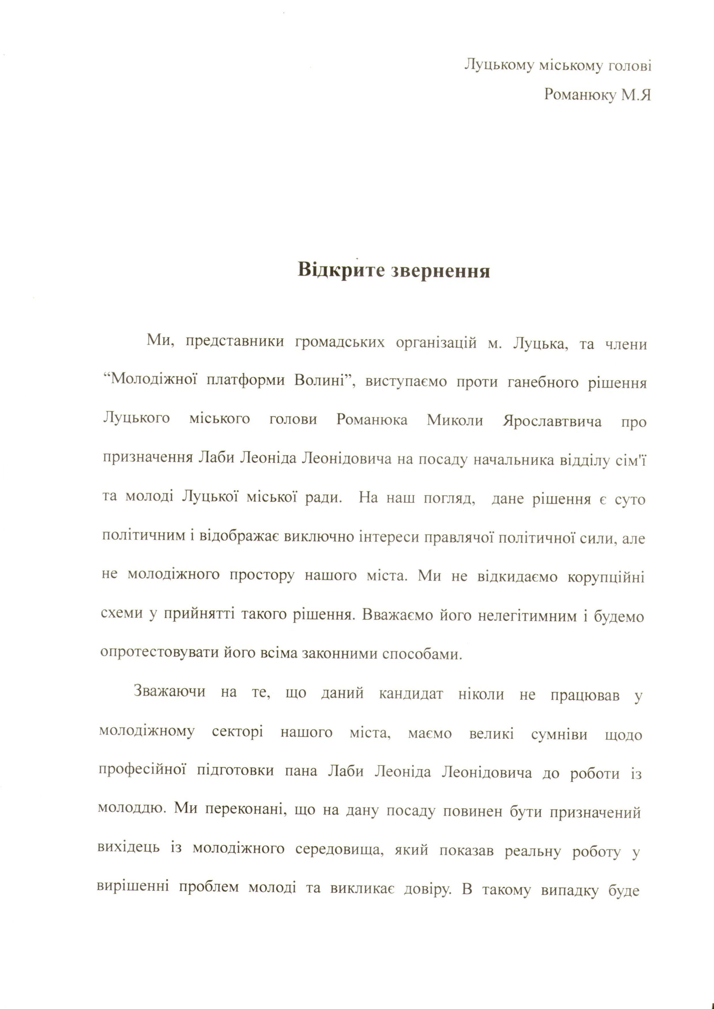 «Вважаємо його нелегітимним і будемо опротестовувати його всіма законними способами», – пишуть громадські активісти у зверненні до Луцького міського голови Миколи Романюка.