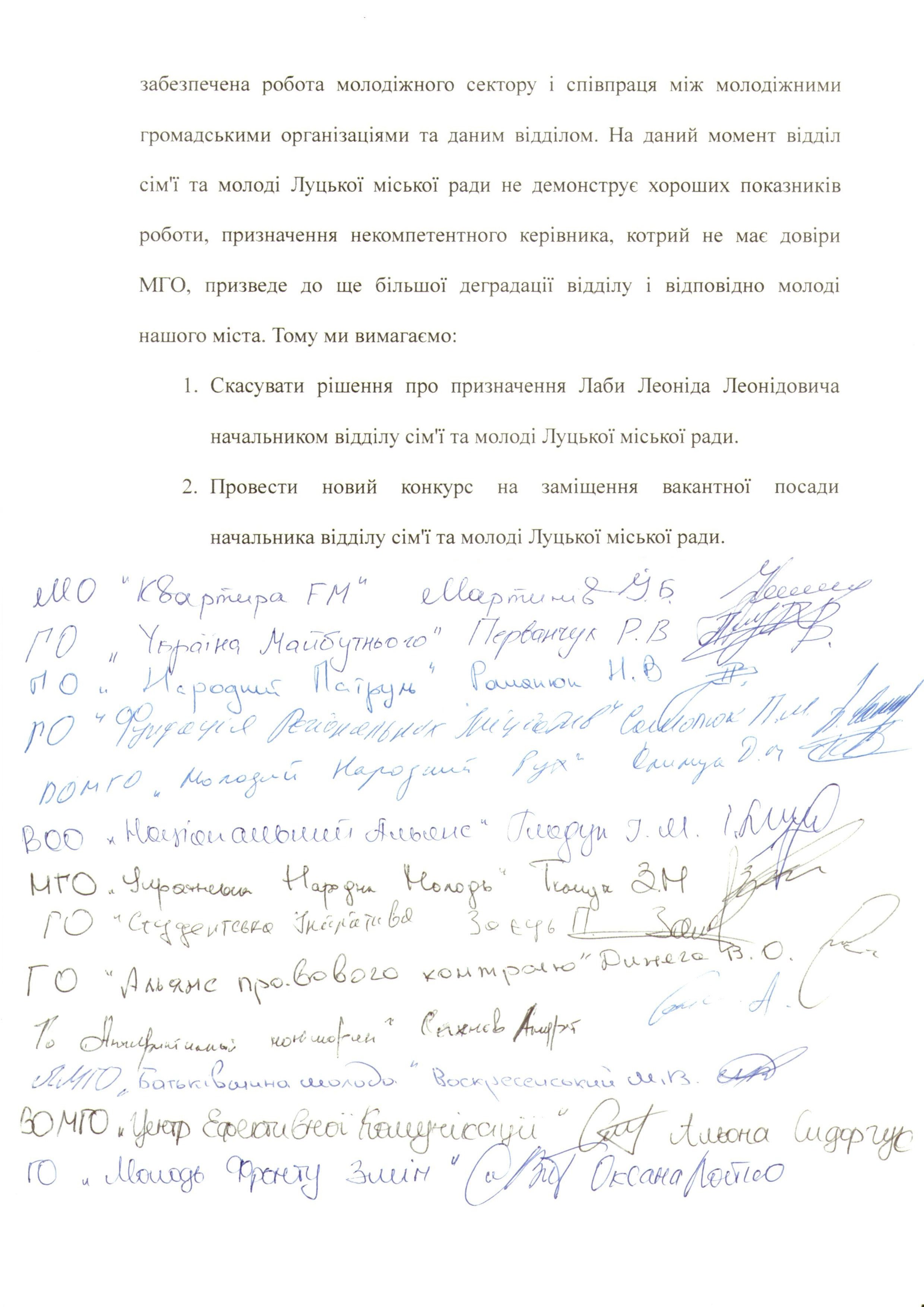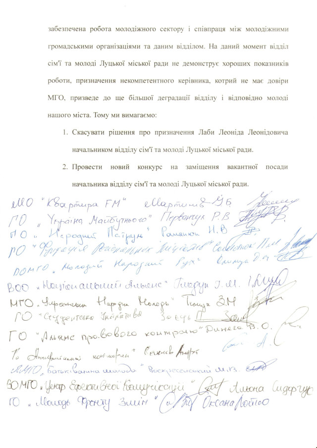 «Ми переконані, що на цю посаду повинен бути призначений «вихідець» із молодіжного середовища, який показав реальну роботу у вирішенні проблем молоді та викликає довіру. В такому випадку буде забезпечена робота молодіжного сектору і співпраця між молодіжними організаціями», – йдеться у тексті звернення.