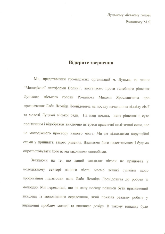 Молодіжні організації Луцька протестують проти призначення Леоніда Лаби - сина депутата міськради із фракції ПР Леоніда Лаби на посаду начальника відділу сім’ї та молоді Луцької міської ради.