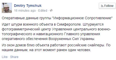 "Оперативні дані групи "Інформаційний спротив". Іде штурм військового об'єкта в Сімферополі. Штурмується фотограмметричний центр Управління центрального військово-топографічного й навігаційного Головного управління оперативного забезпечення Збройних Сил України", - написав він.