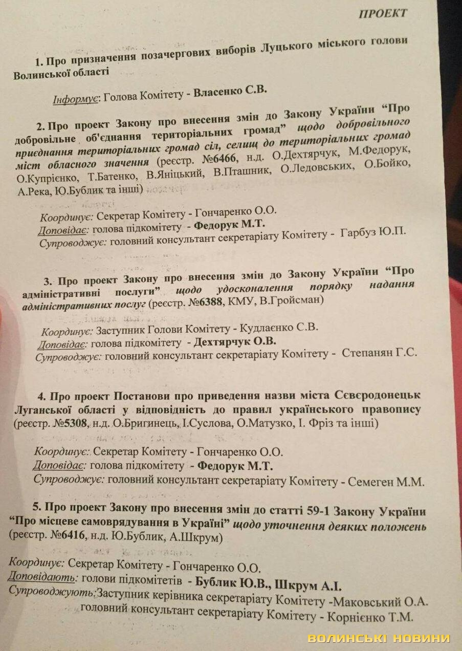 У порядку денному Комітету питанням номер один стояло «Про призначення позачергових виборів Луцького міського голови Волинської області».