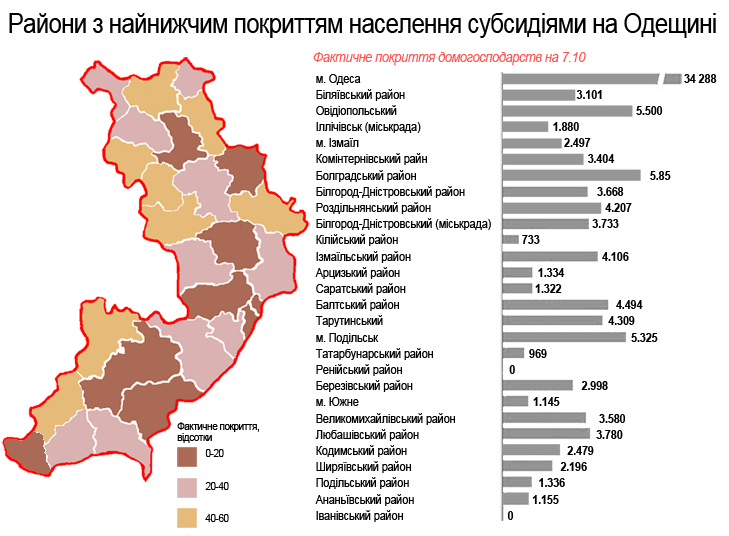 Саакашвілі повністю "завалив" субсидійну кампанію у колишній вотчині. На сьогодні рівень покриття населення субсидіями знаходиться на одному з найнижчих рівнів по країні. Зокрема найгірша ситуація станом на початок жовтня в Саратському, Арцизькому, Татарбунарському і Кілійському районах. А у потенційно вибухонебезпечному Ренійському - взагалі нуль. Також з нульовим показником йде Іванівський район. У цілому ж по області становище просто катастрофічне. І зовсім не тому, що мешканці Одещини відмовляються від субсидій. Причина, вочевидь, у вкрай поганій організації їх оформлення місцевими чиновниками.